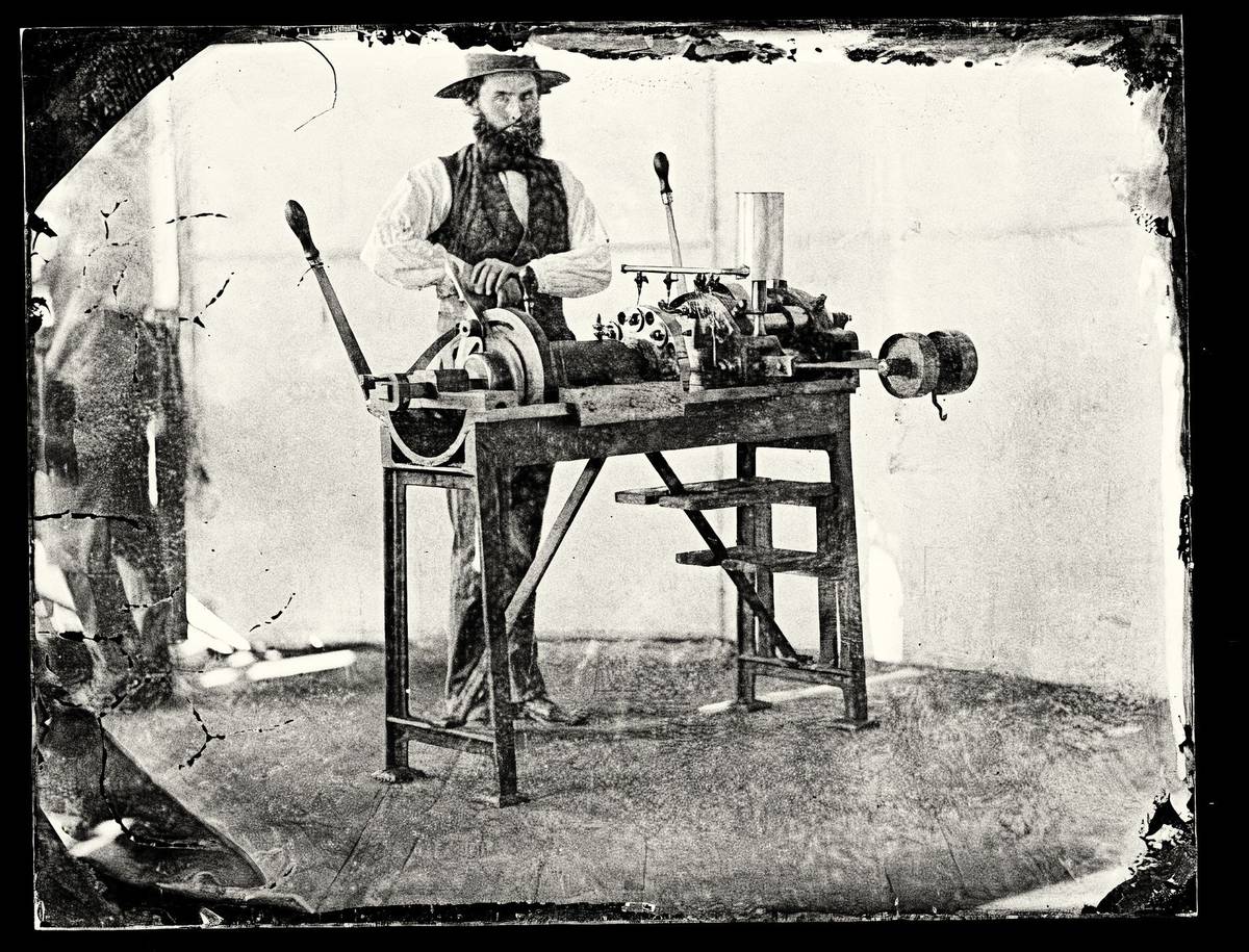 Coltova továrna vyráběla také Gatlingův kulomet, který navrhl americký konstruktér Richard Jordan Gatling. Šlo o jednu z prvních úspěšných realizací kulometu. Na snímku vidíte Colta při výrobě tohoto modelu zbraně.