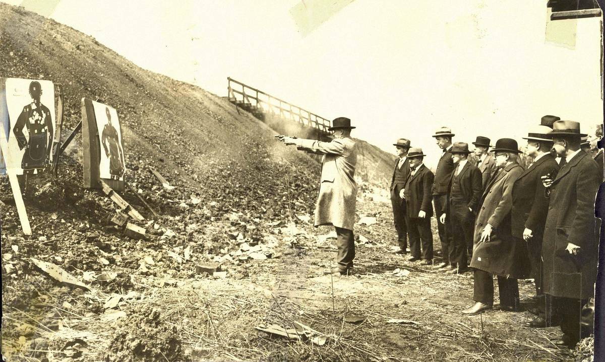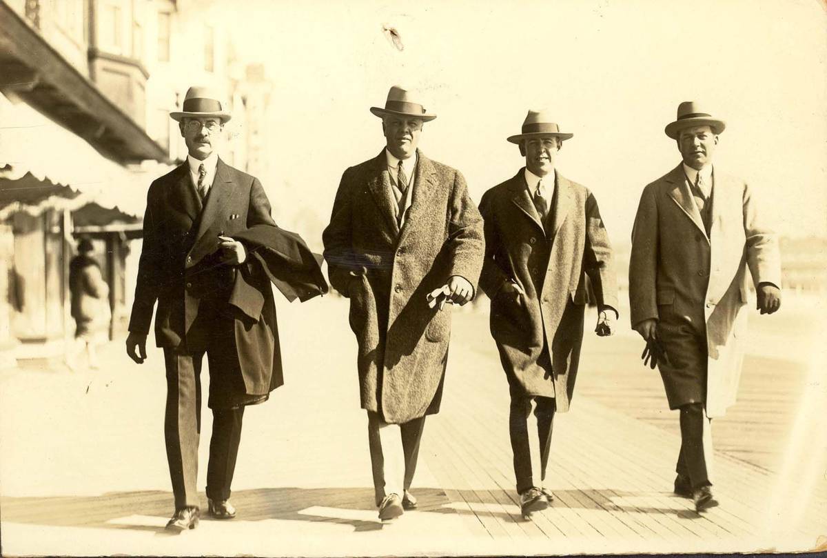 Skupinový portrét (zleva): ředitelé společnosti Colt Samuel M. Stone a Dwight G. Phelps s dvěma neznámými muži kráčejí po promenádě. Samuel M. Stone začínal v roce 1905 u společnosti Colt jako prodavač, o jedenáct let později se stal jejím viceprezidentem a v letech 1921 až 1944 zastával funkci prezidenta firmy. Na konci 40. let byl viceprezidentem a ředitelem společnosti Colt Phelps.
