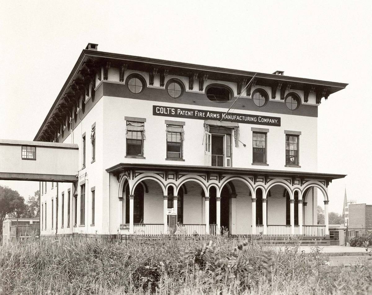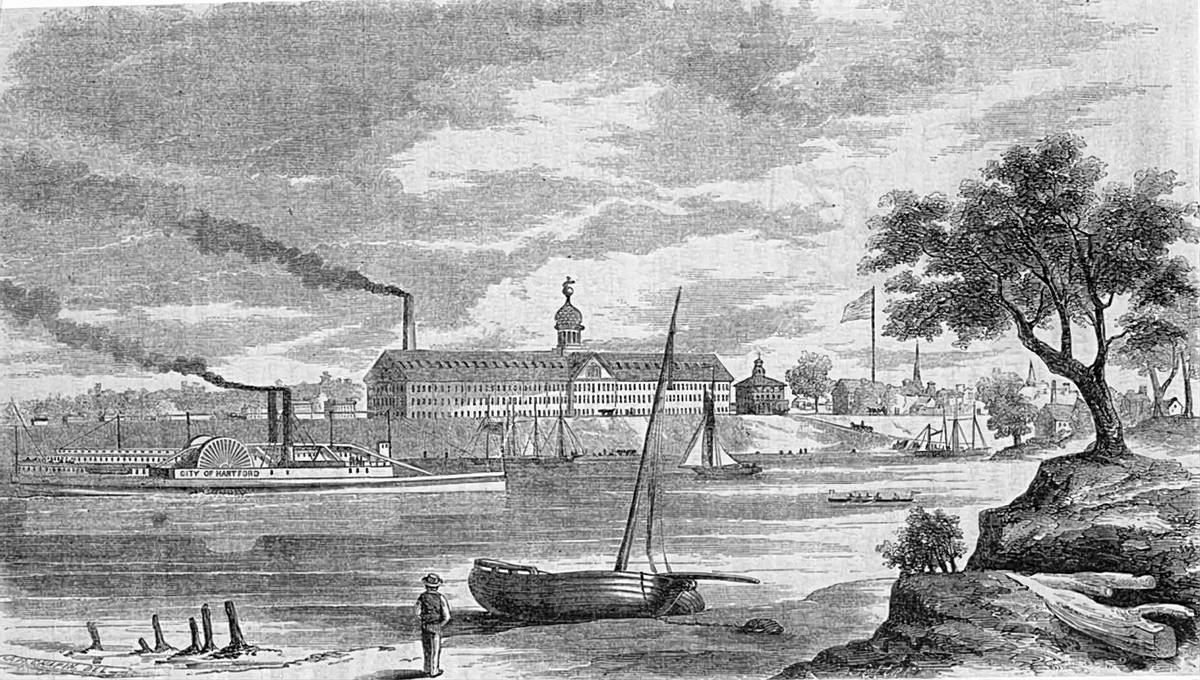 Colt v polovině 19. století zakládá továrnu ve svém rodném městě Hartford v Connecticutu. Díváte se na původní budovu zbrojovky.