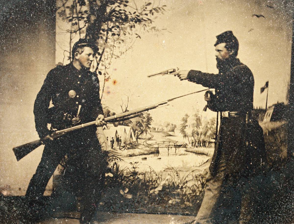 A zde s ním "šermuje" neznámý voják v uniformách Unie. Naproti němu pózuje voják ze stejného tábora se střelnou zbraní, konkrétně jde o Springfield Model 1861.