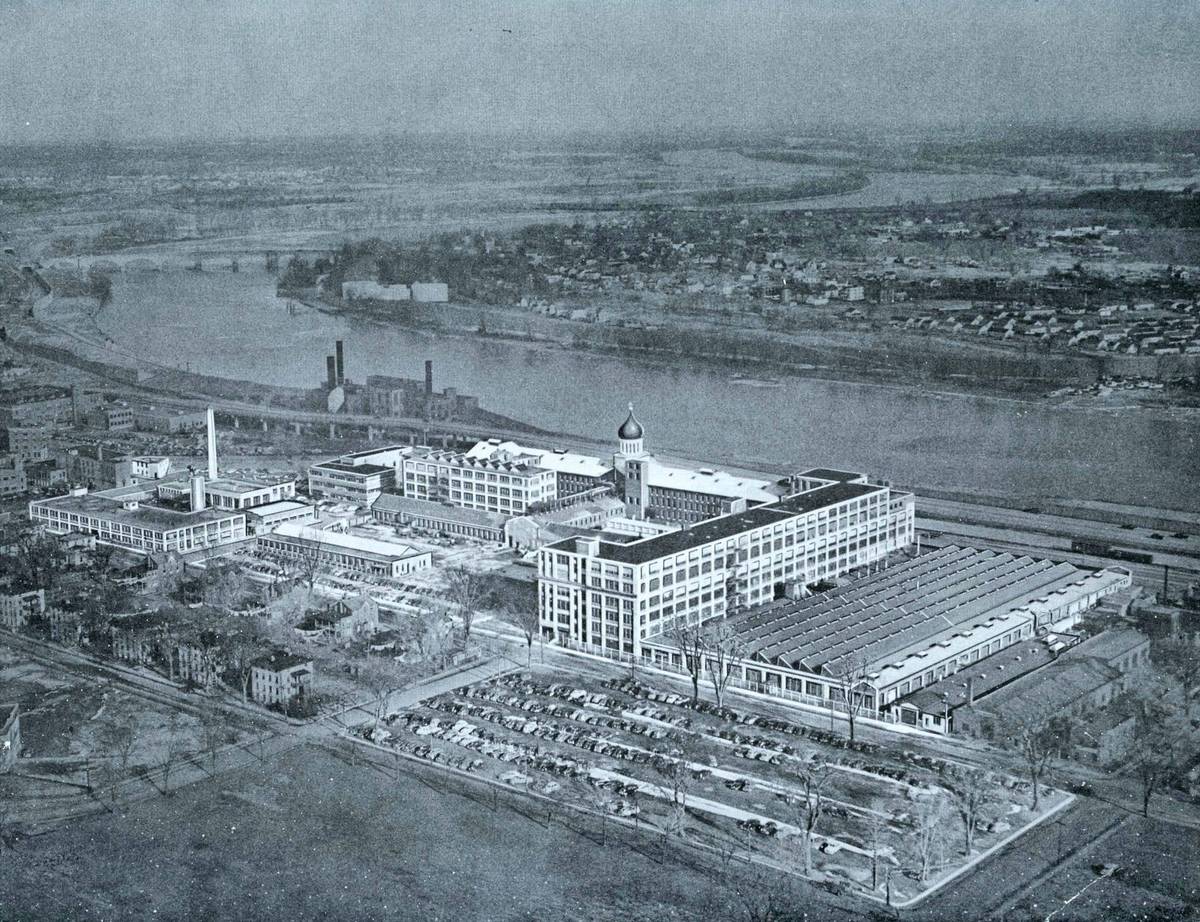 Zde budova továrny v Hartfordu na snímku z roku 1900.