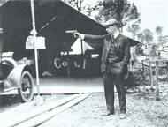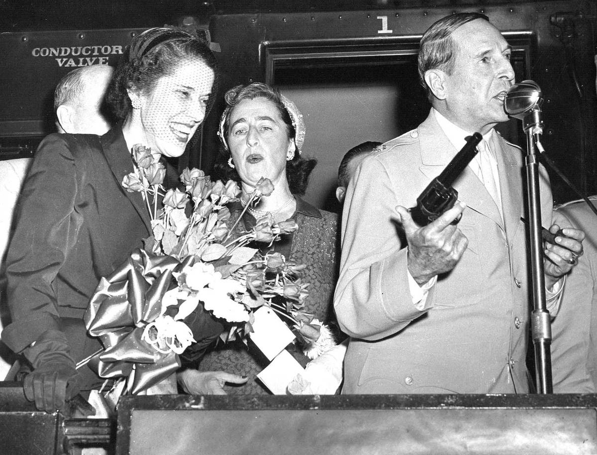 Generál Douglas MacArthur stojící na vagonu se dvěma ženami na zastávce v Hartfordu. Zatímco mluví do mikrofonu, drží v ruce revolver Colt Single Action Army.