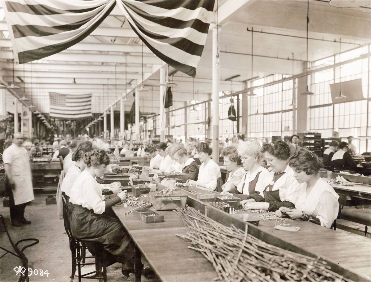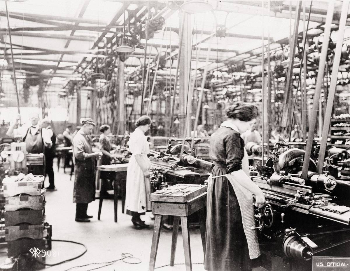 Zaměstnanci továrny v období první světové války mezi lety 1914 a 1918.