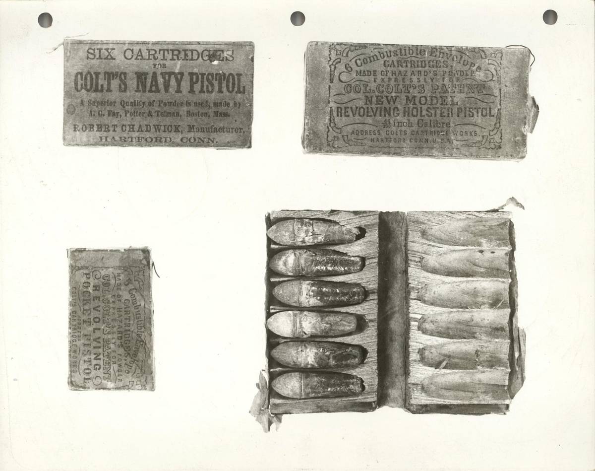 Čtyři balíčky s náboji do revolverů Colt včetně jednoho otevřeného balíčku.