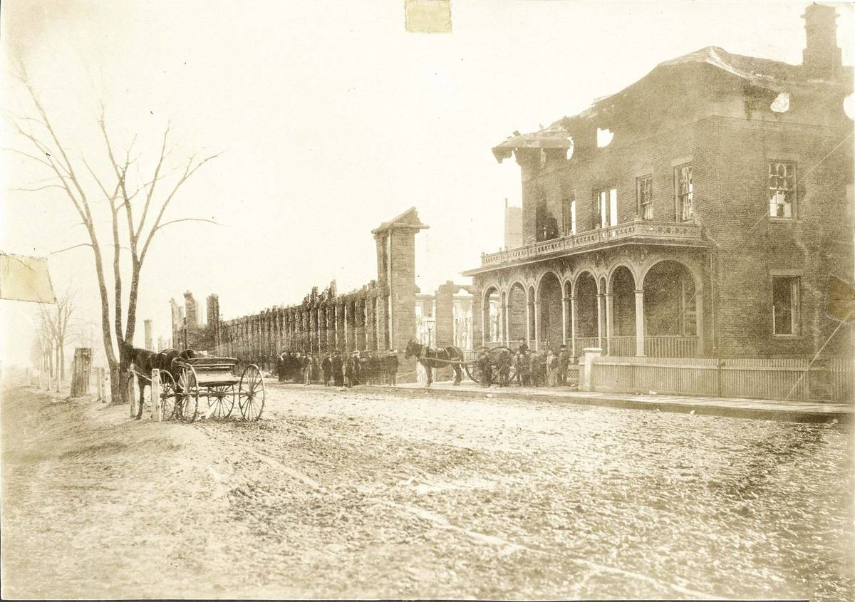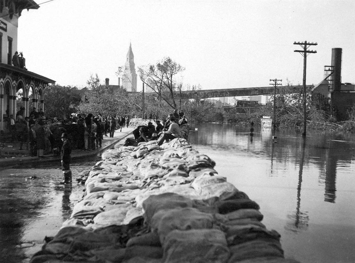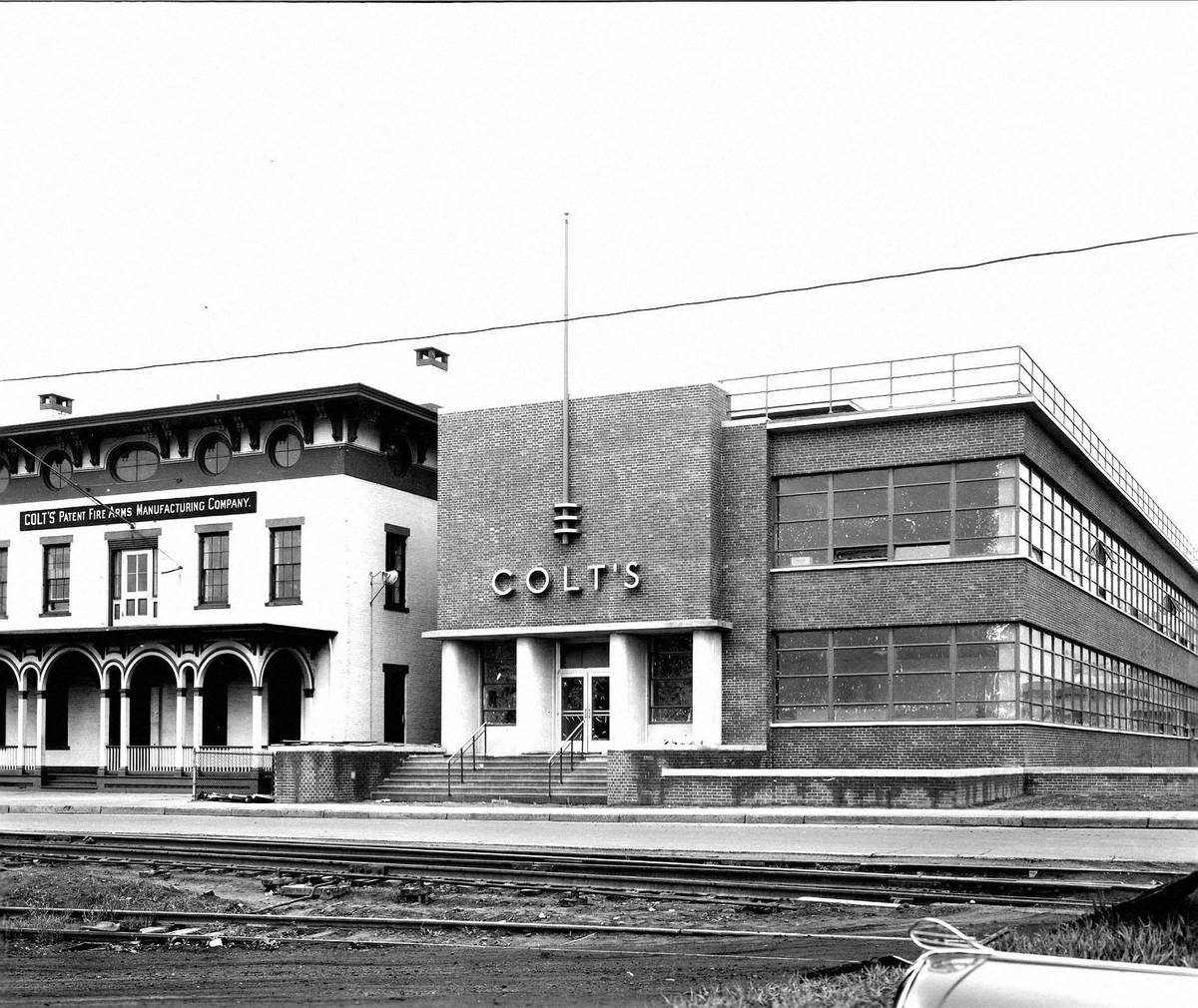 V roce 1938 zasáhl okolí Coltovy továrny hurikán. Pytle s pískem tvořily ochrannou hrázi. Početná skupina lidí se shromáždila před kancelářskou budovou (vlevo), továrnou Kendall (vpravo) a Travelers Tower (v dálce).