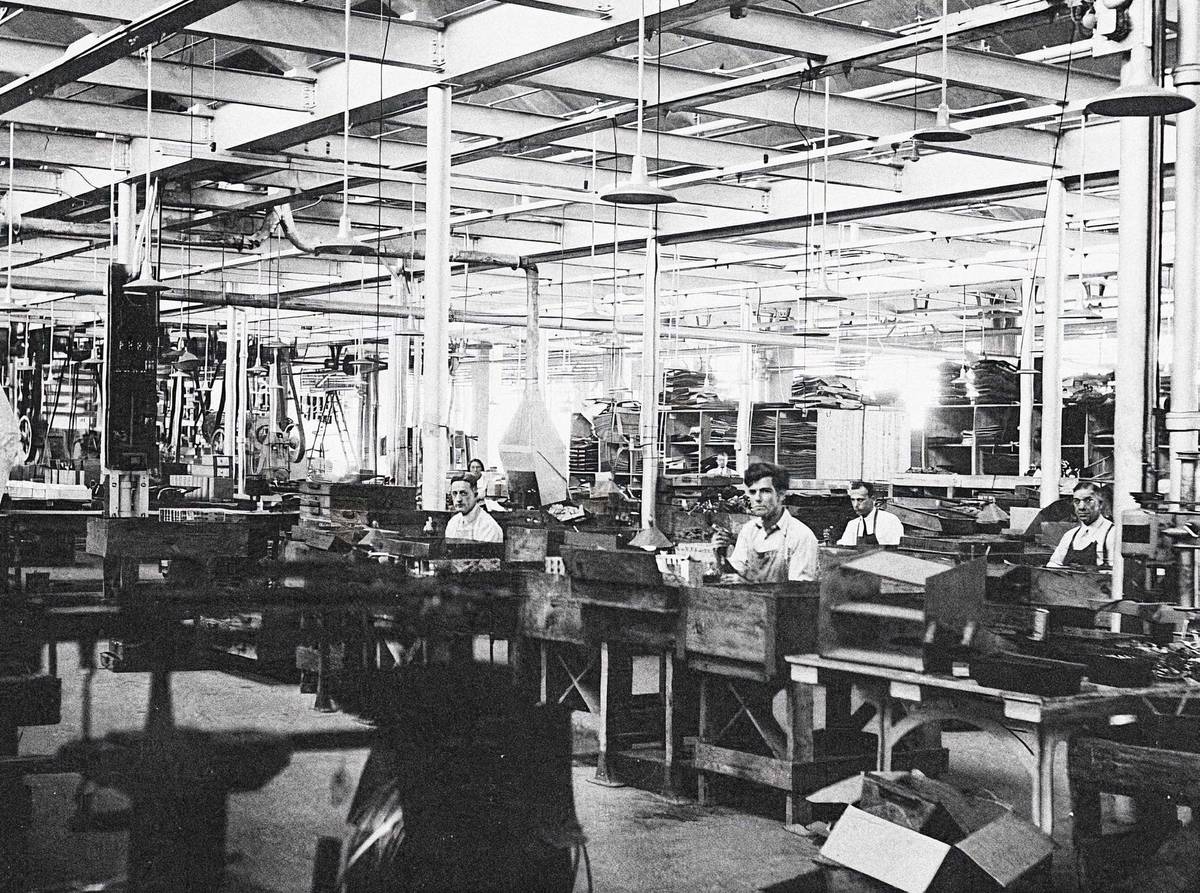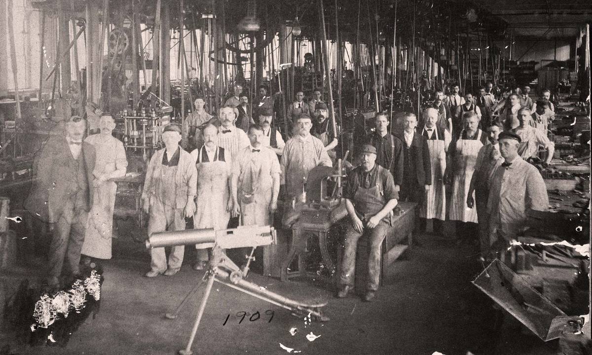 Skupinová fotografie dělníků montážní linky z roku 1909. V popředí stojí kulomet.