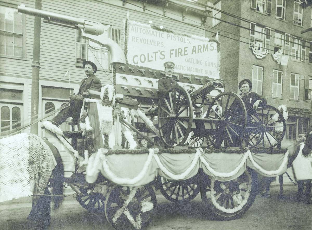 Na snímku je slavnostní vůz z přehlídky v Hartfordu. Skládá se z různých Gatlingových děl a Coltových automatických zbraní.