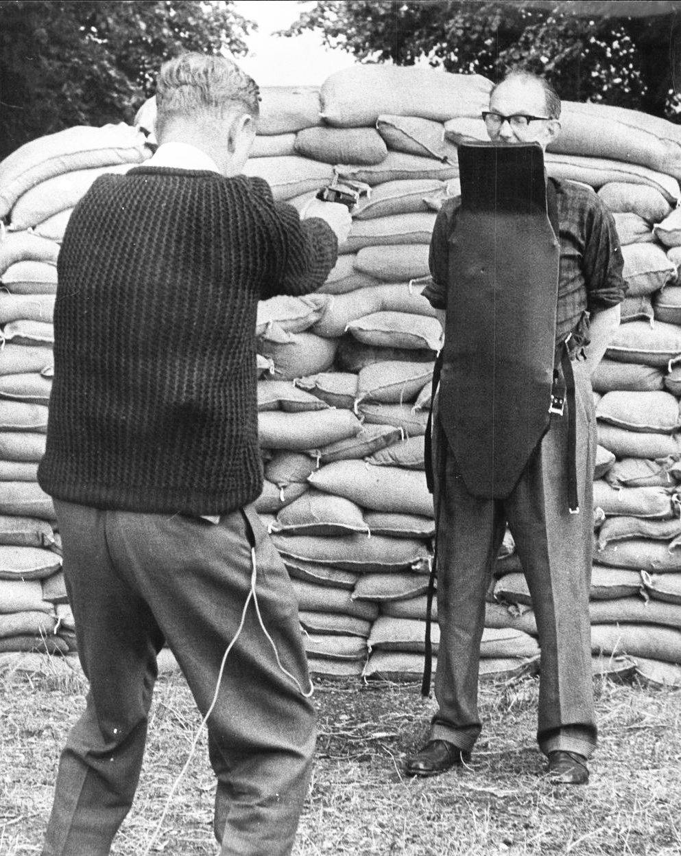 6. června 1968. Vynálezce Bill Walton zkoušel, zda jeho neprůstřelný štít, původně určený pro policii, opravdu funguje. Štít vyrobil ze speciální oceli, silné pěnové gumy a vinylu. Střílelo se na něj Coltovými zbraněmi - Coltem .45, zbraní Jamese Bonda Walther PPK a Coltem .44 Magnum. Testování proběhlo před televizními kamerami pro BBC Tomorrow's World.
