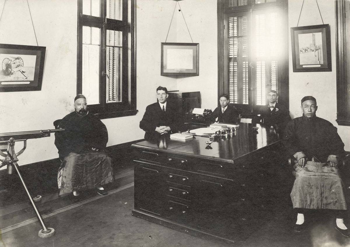 Dva čínští úředníci v tradičním oděvu sedí se třemi zaměstnanci společnosti Colt v kanceláři společnosti Colt's Compradors v Šanghaji v Číně.