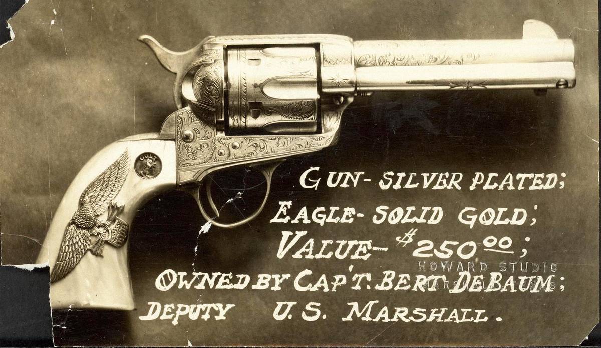 Postříbřený a rytý revolver Colt Single Action Army, který kdysi vlastnil kapitán Bert DeBaum.