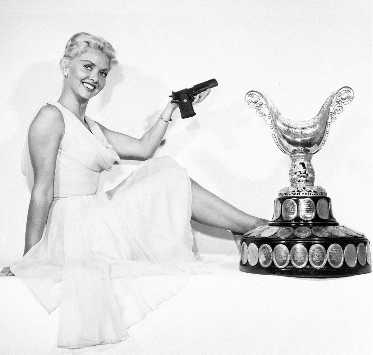 Blonďatá modelka s pistolí Colt National Match M1911 sedící vedle velké trofeje od americké asociace motorových člunů (APBA).