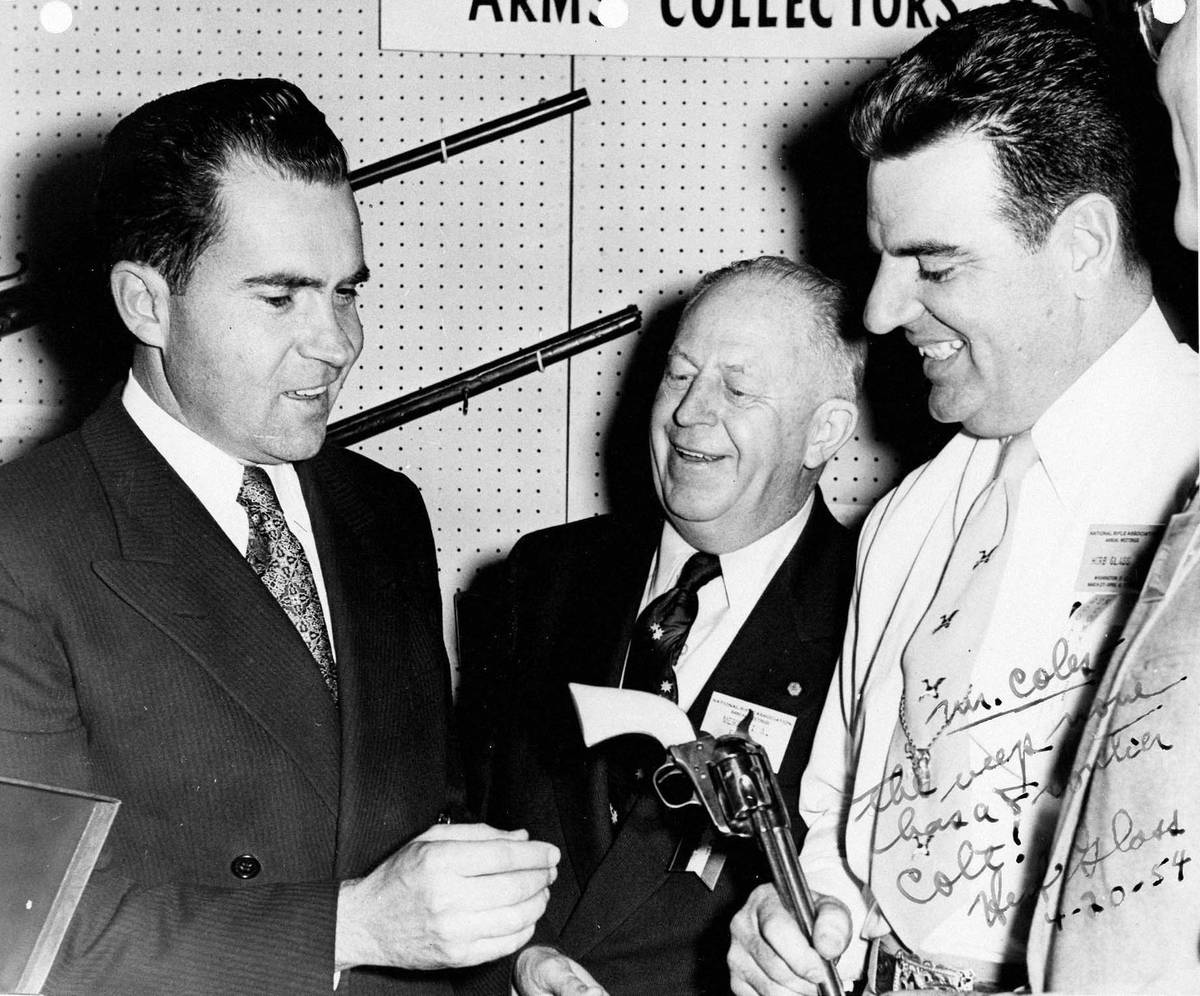 Na této fotografii z 60. let minulého století drží revolver ze stáje společnosti Colt americký viceprezident a budoucí šéf Bílého domu Richard Nixon. Uprostřed je zachycen generál Merritt Edson z Národní střelecké asociace.