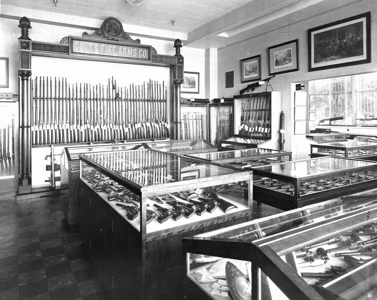 Arthur L. Ulrich, po kterém se pojmenovalo muzeum, pózuje před velkou ukázkou revolverů a pistolí Colt. V Coltu začínal jako stenograf a později se stal tajemníkem společnosti a historikem.