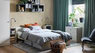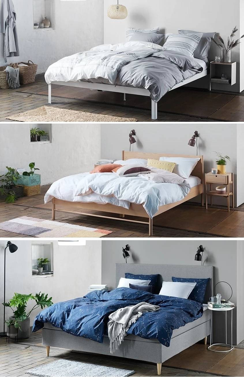 V místnostech, kam by se příliš mnoho bytového textilu nehodilo, jej může dobře zastoupit například čalouněný rám postele. Model Slattum v rozměru 160x200 cm stojí 3490 Kč.