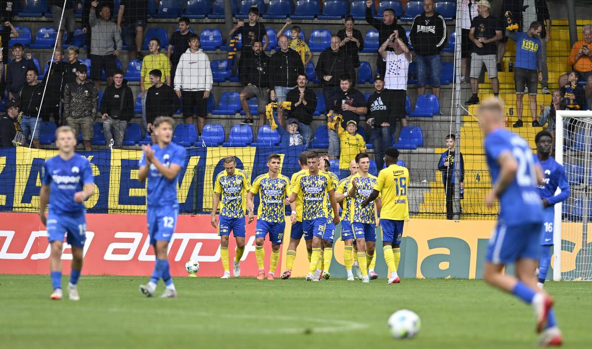 Utkání 6. kola první fotbalové ligy: FK Teplice - FK Jablonec, hosté slaví první branku zápasu.