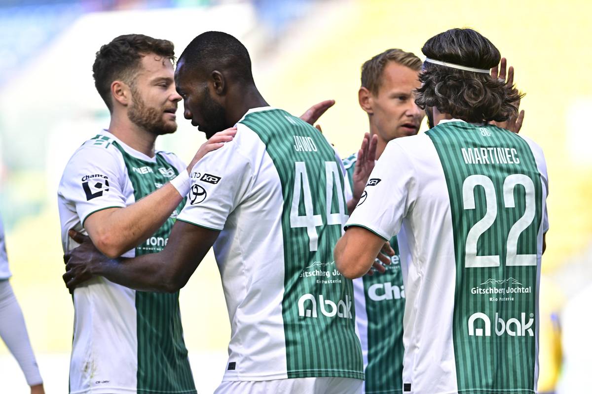 Utkání 6. kola první fotbalové ligy: FK Teplice - FK Jablonec, hostující Lamin Jawo v objetí spoluhráčů