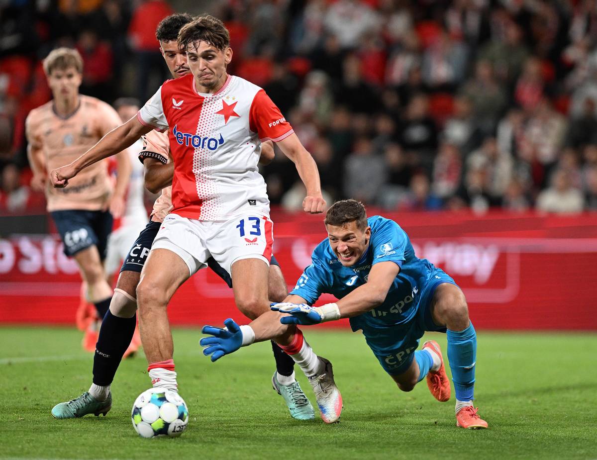 Mojmír Chytil ze Slavie a brankář Jáchym Šerák z Pardubic
