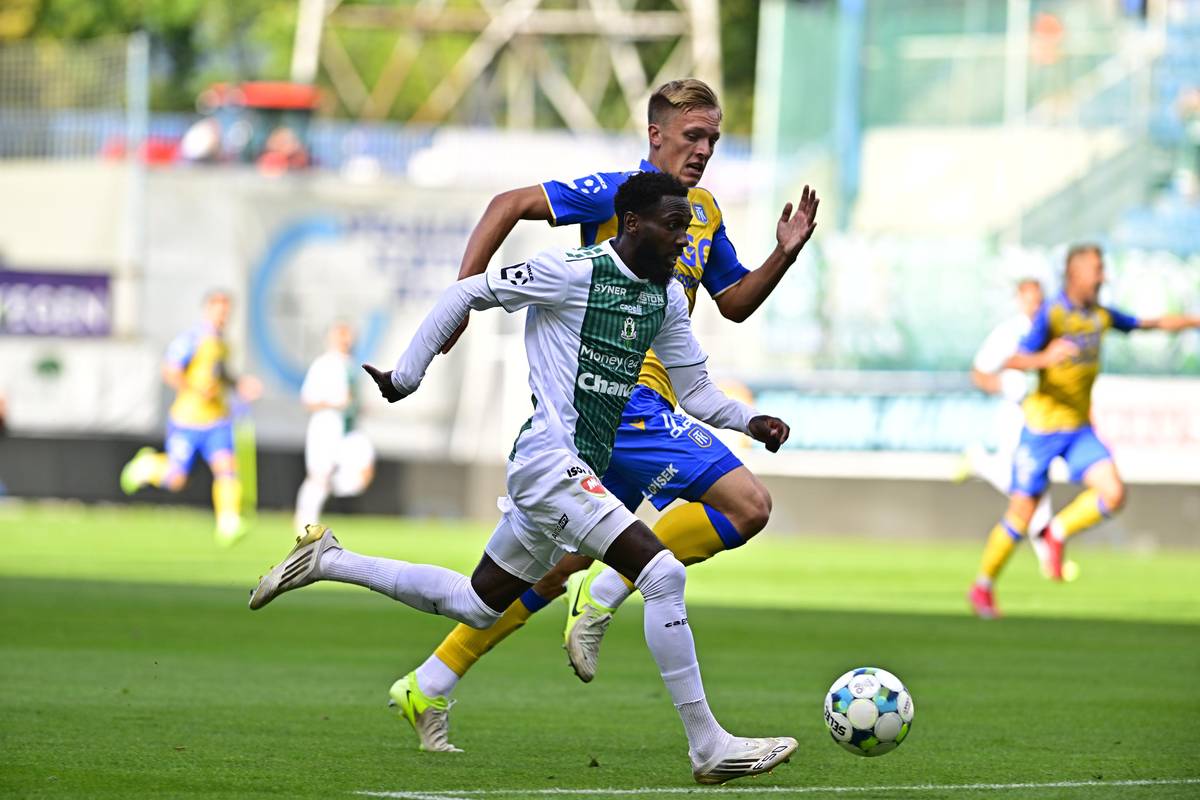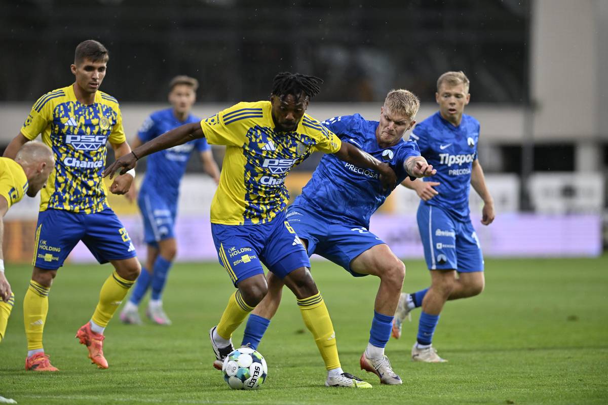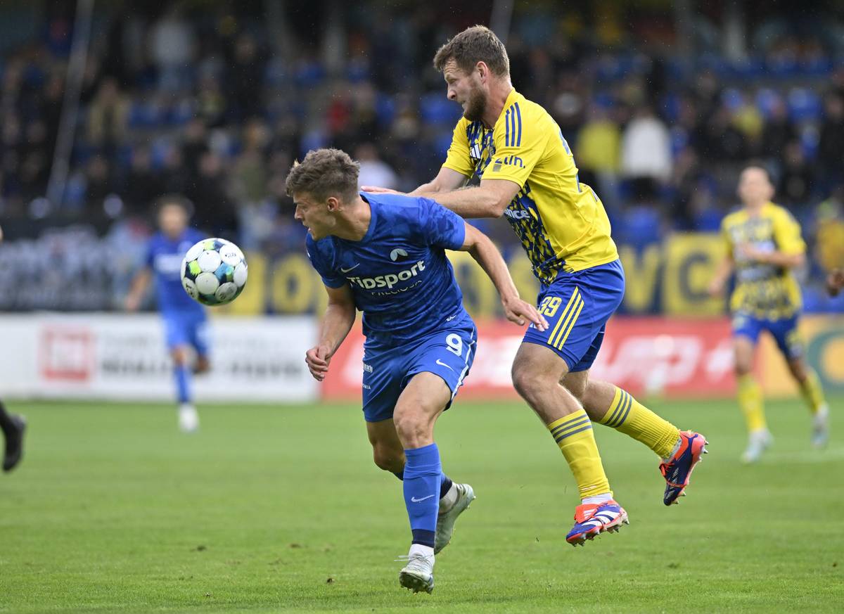 Utkání 6. kola první fotbalové ligy: FK Teplice - FK Jablonec, do útoku se řítí hostující Alexis Alégué, kterého stíhá Nojus Audinis.