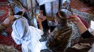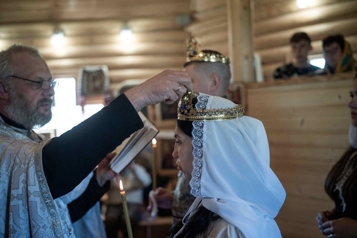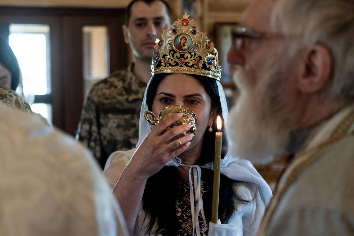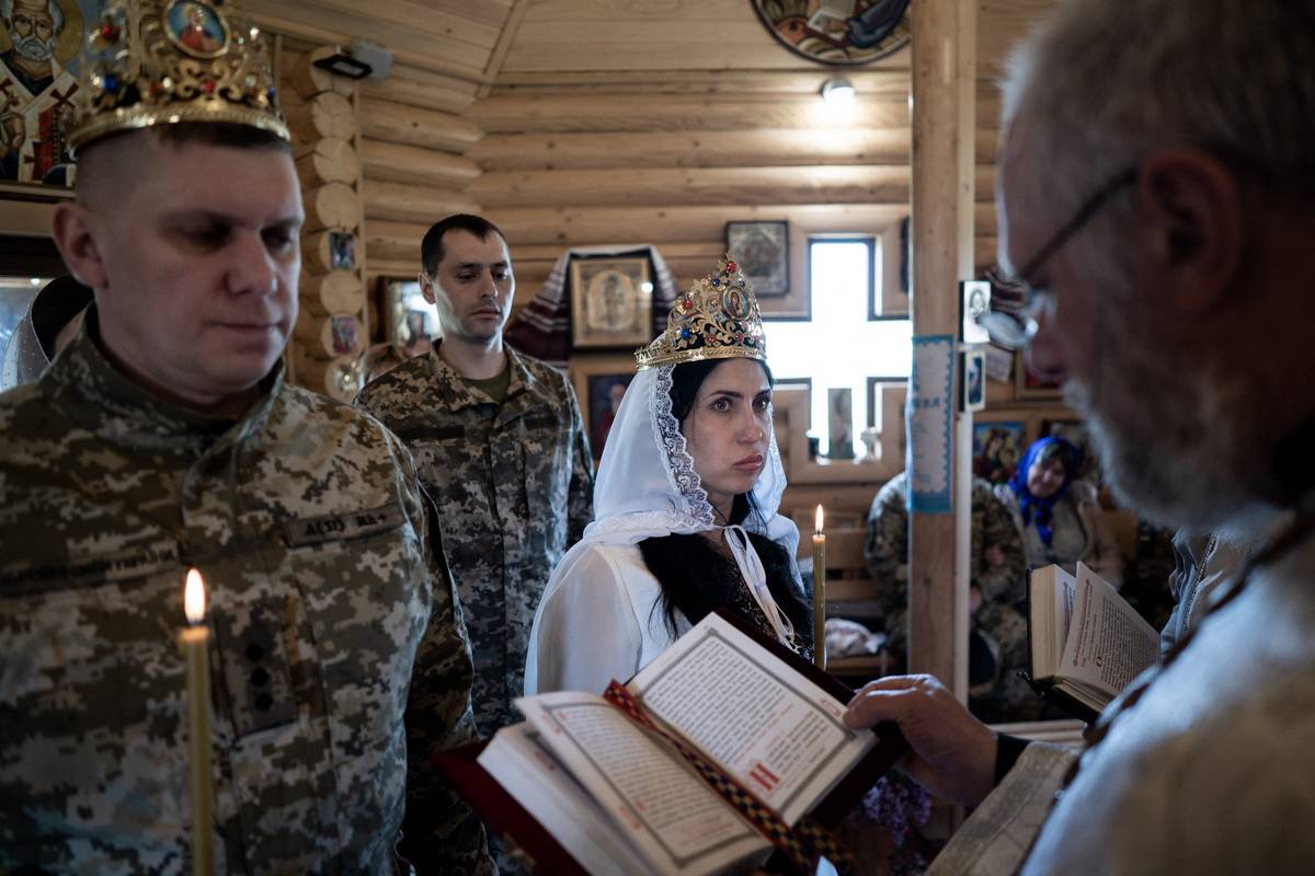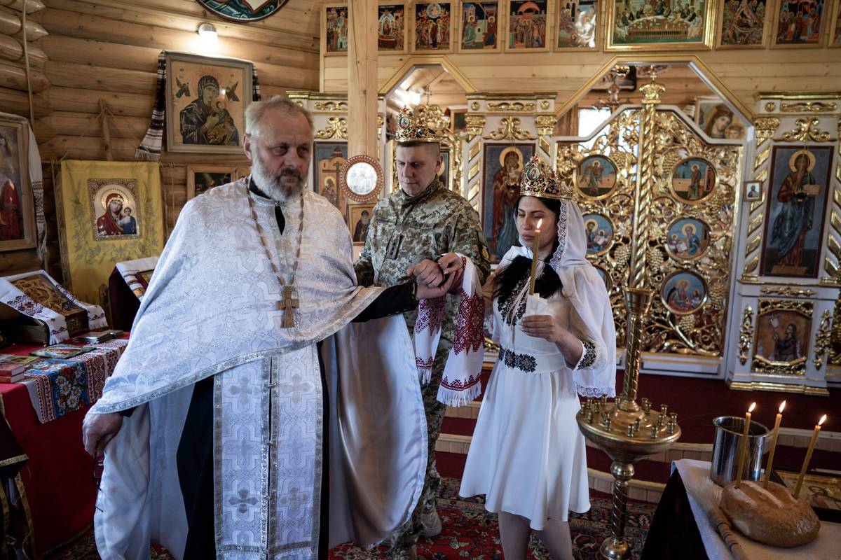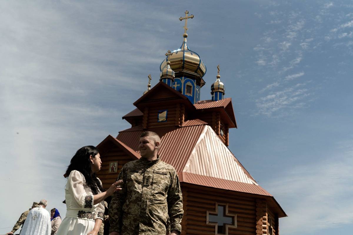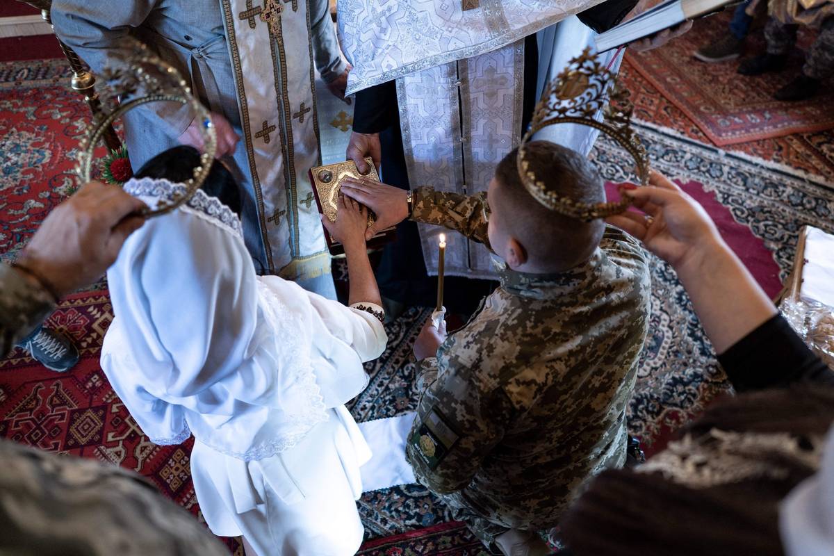 Ukrajinský frontový voják Anton a jeho vyvolená Oksana při svatebním obřadu v lymanském kostele během pokračující rusko-ukrajinské války.