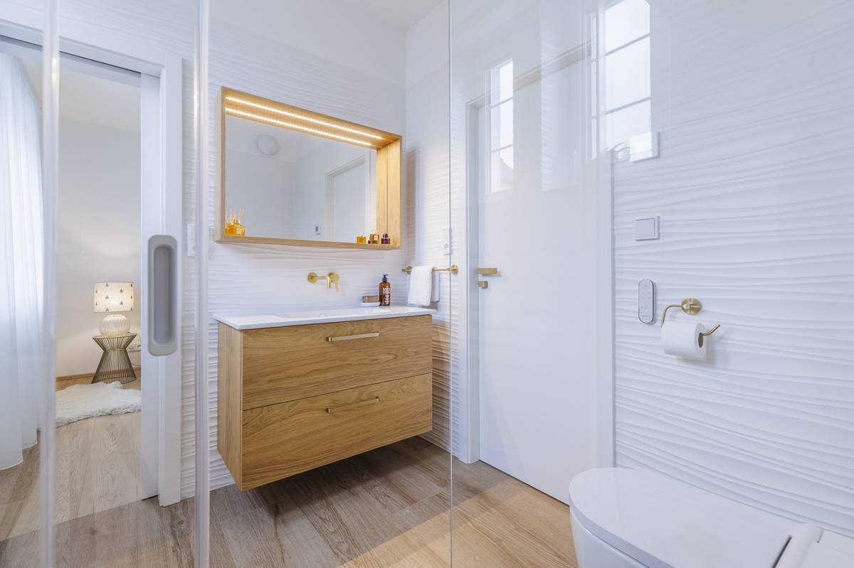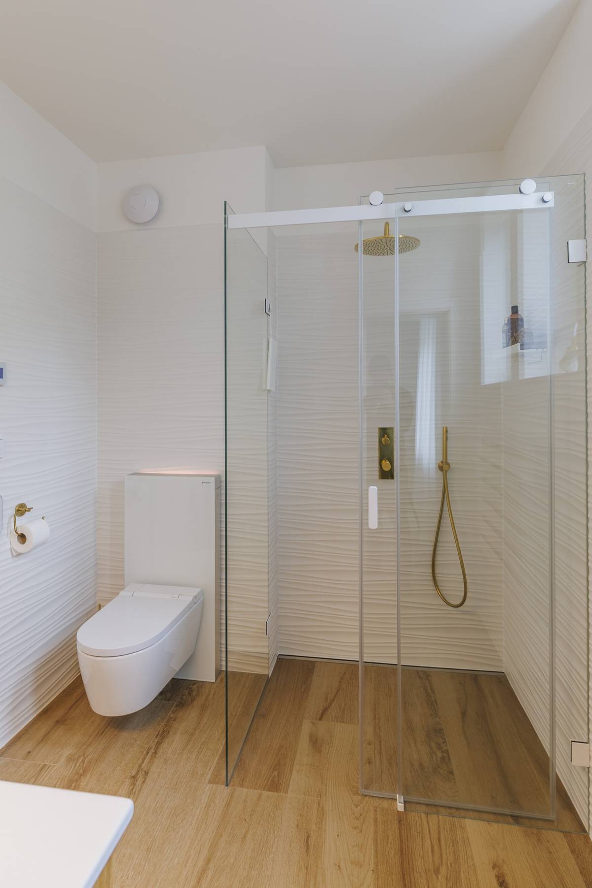 Také v koupelně jsou patrné zlaté akcenty, například na bateriích či úchytkách