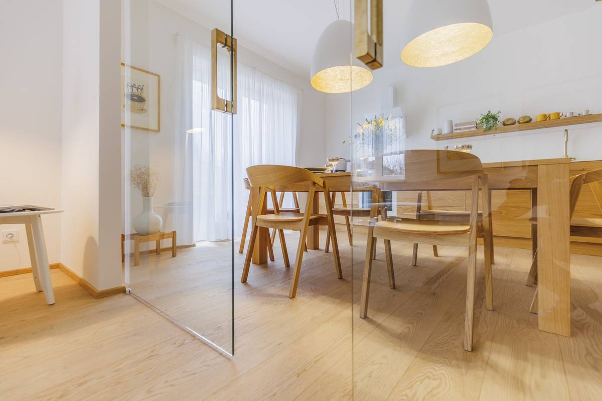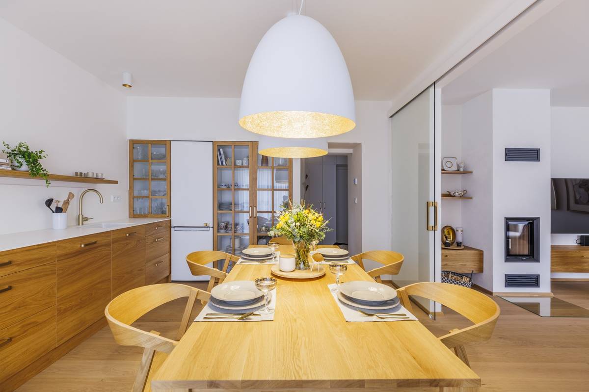 Skleněné dveře oddělují kuchyň od hlavní obývací části