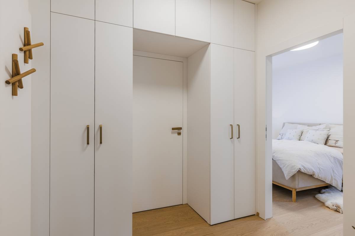 Vestavěné skříně na chodbě jsou v bílém laminu se sametovou úpravou