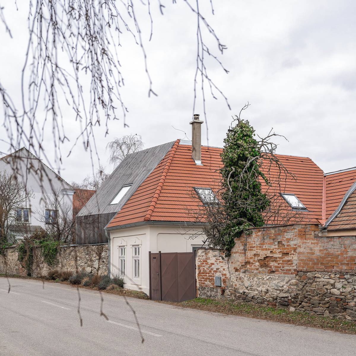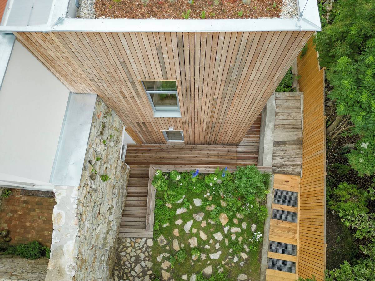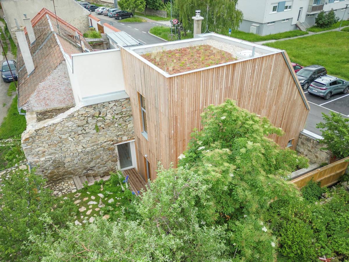 Architekti museli řešit komplikace například se vstupem. Ten musel navazovat na původní vchod do domu, který se nachází na západní straně fasády a vede otvorem v kamenné zdi.