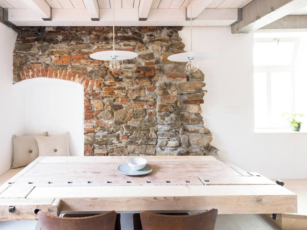 Barevné schéma se drží v neutrálních tónech a dekorativní prvky tvoří především odkryté zdivo. Nejbarevnějším prvkem interiéru se staly žluté posouvací dveře do kuchyně.