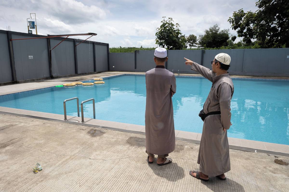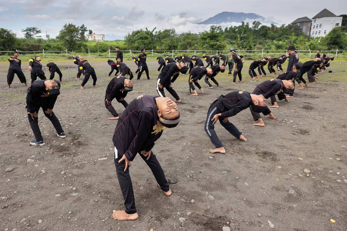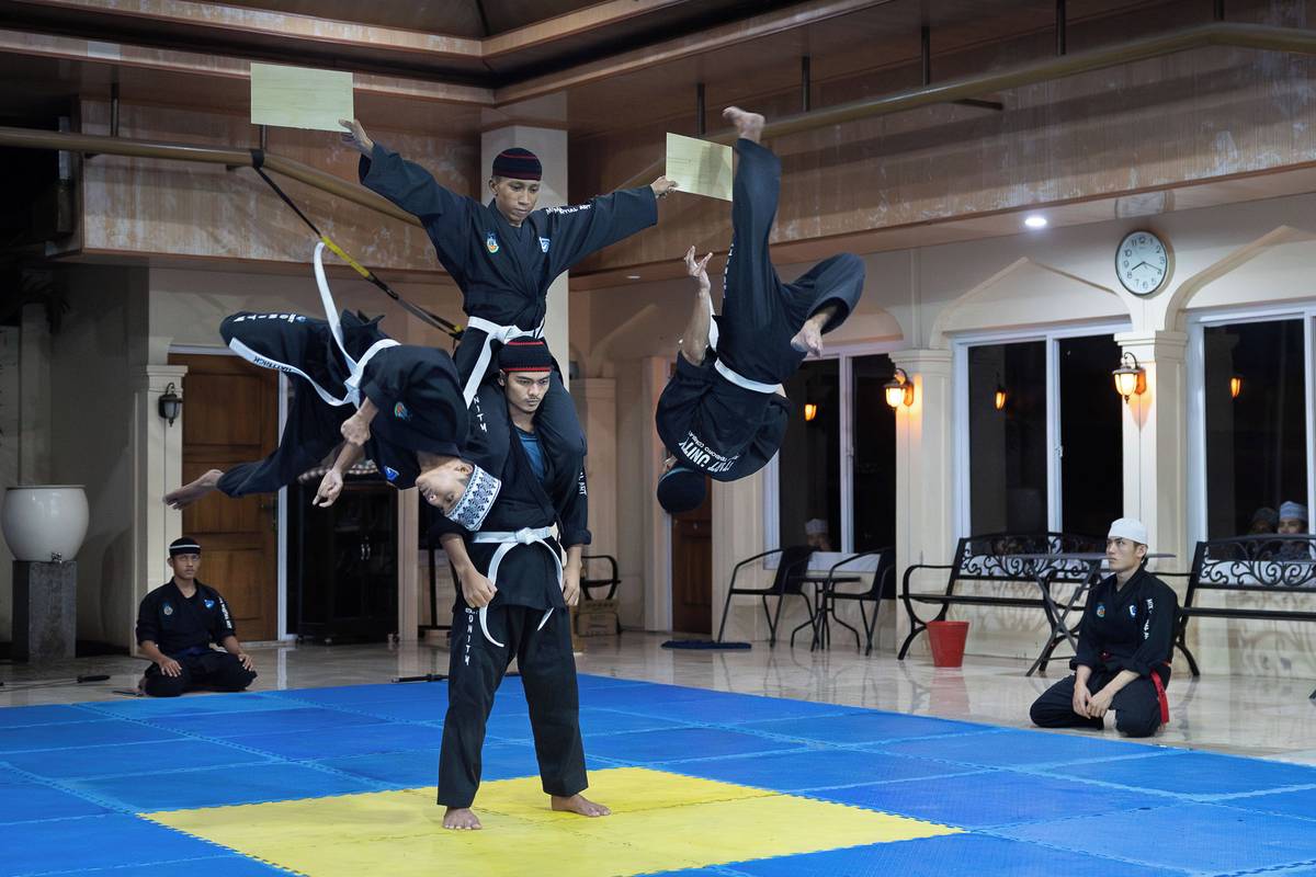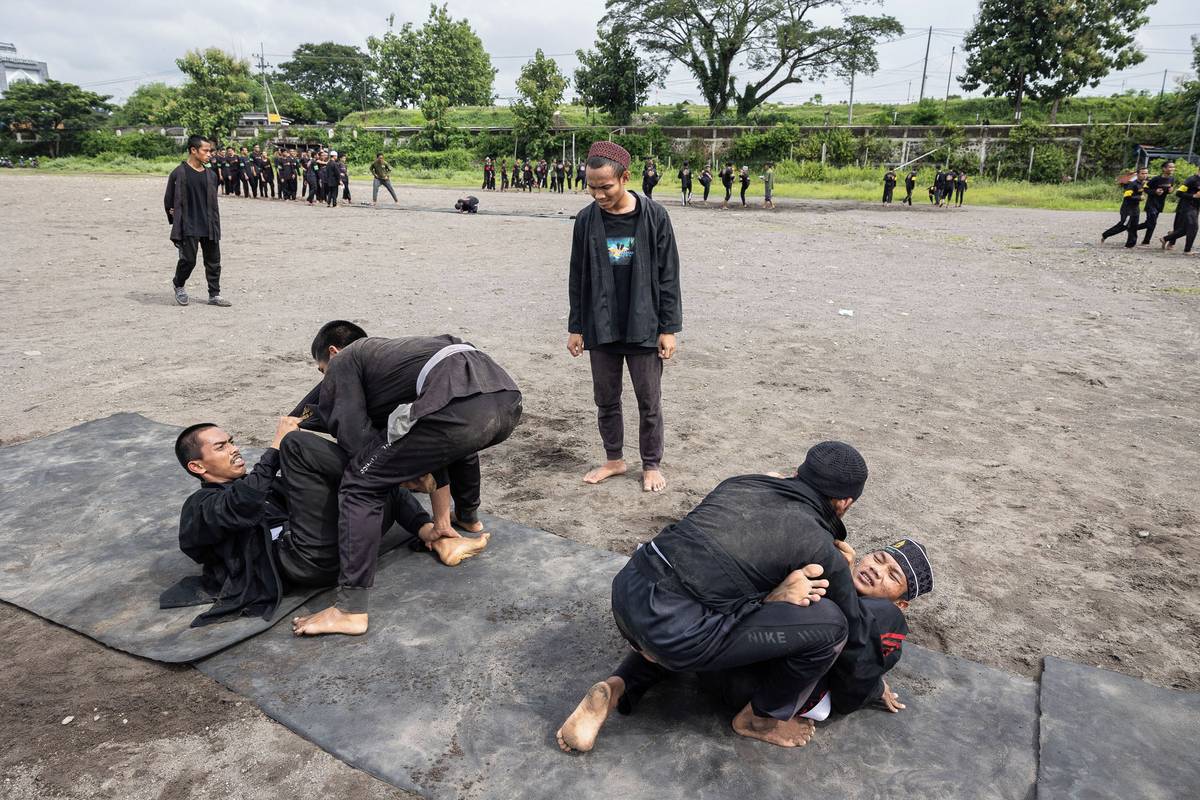Na hřišti trénují žáci speciální bojové umění furusiyah, které vymyslel Syekh Ubaidillah Ahror, jeden ze synů zakladatele školy Syekha Mahmuda.