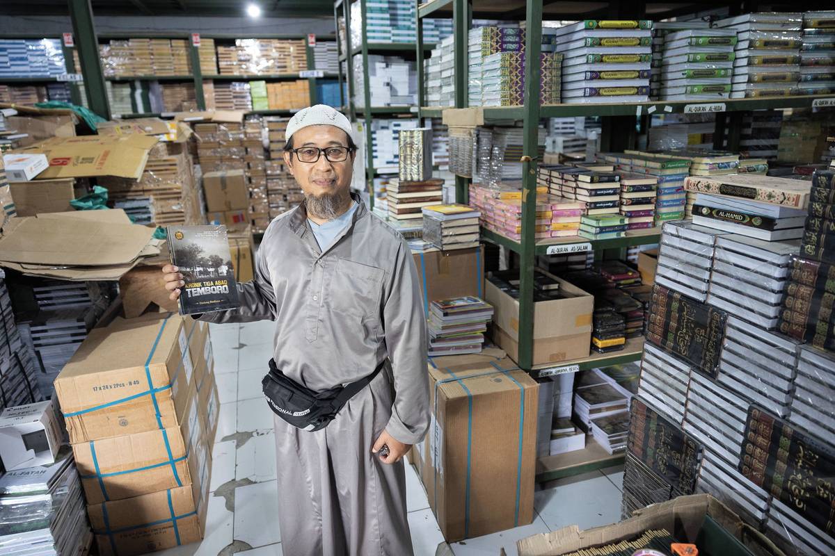 Jednapadesátiletý učitel angličtiny Dadang Budiana ukazuje ve školním skladu učebnic knihu, kterou sepsal o historii Tembora a místní internátní školy Al-Fatah.