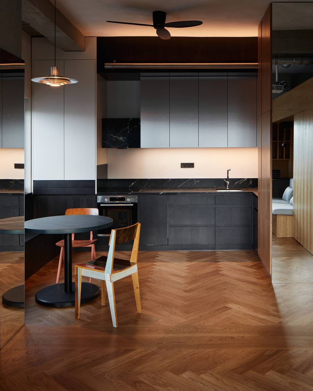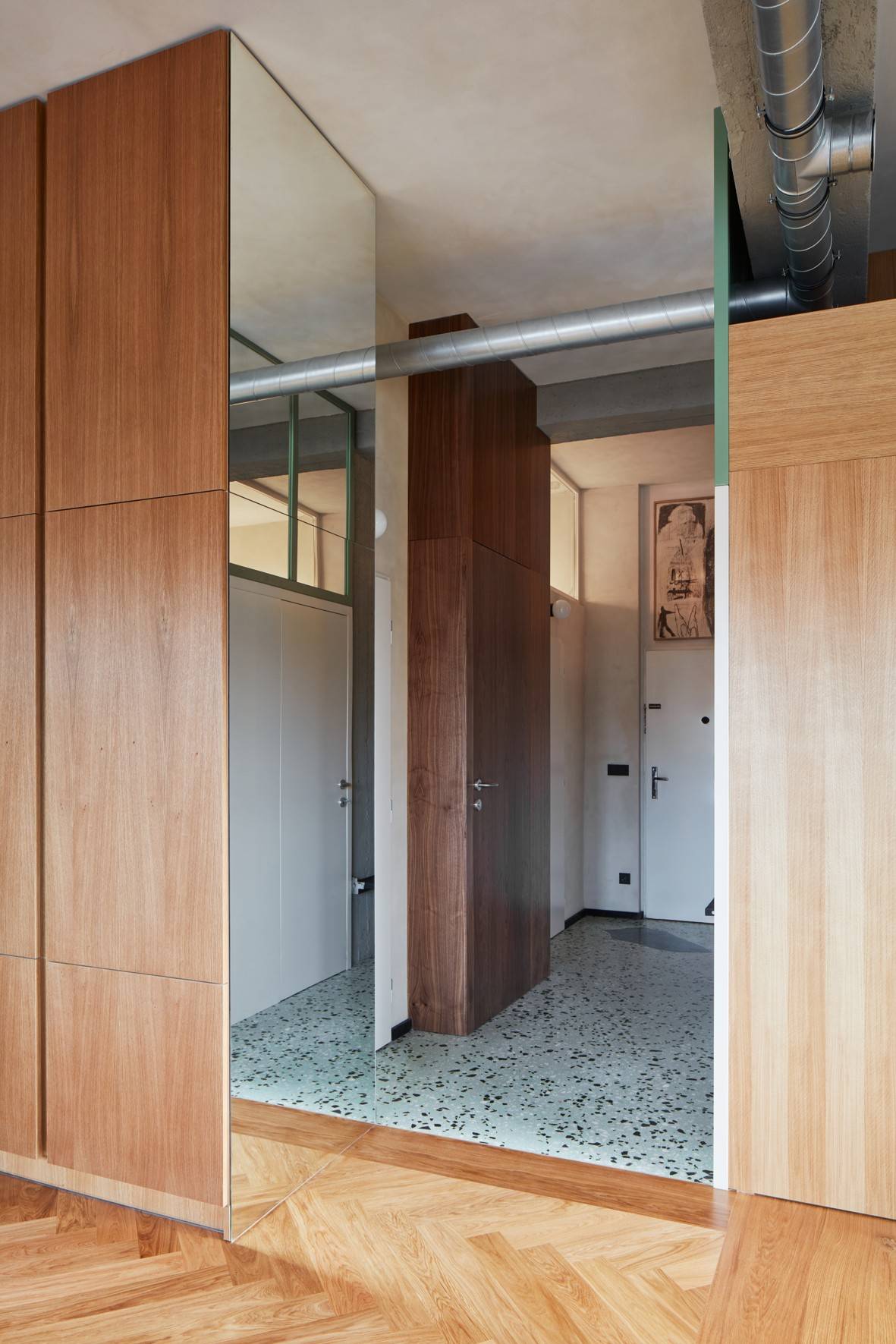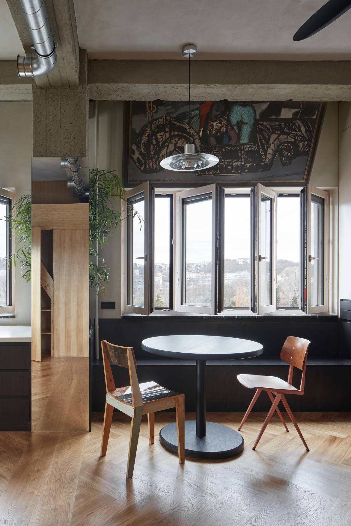 Industriální prvky vyvažuje mimo jiné příjemná dřevěná dýha