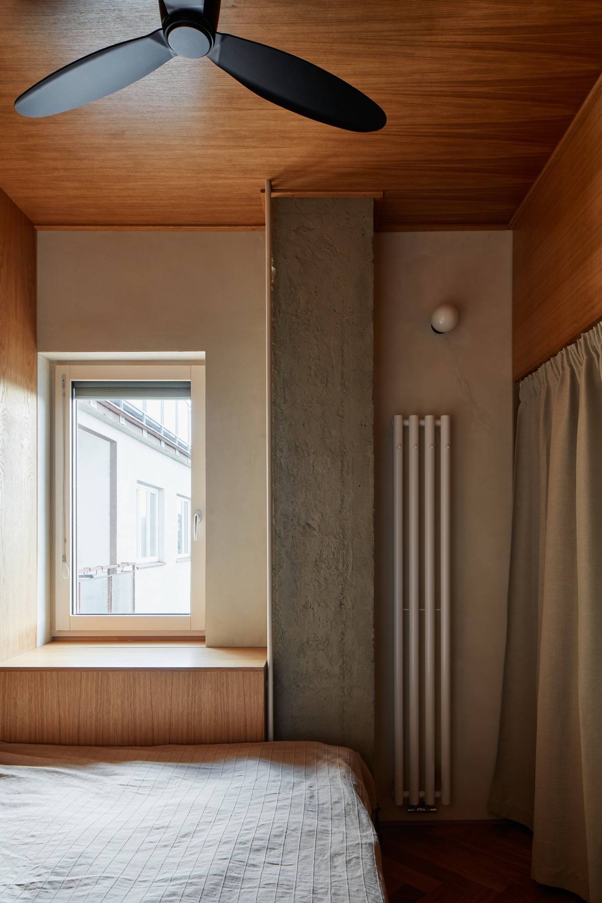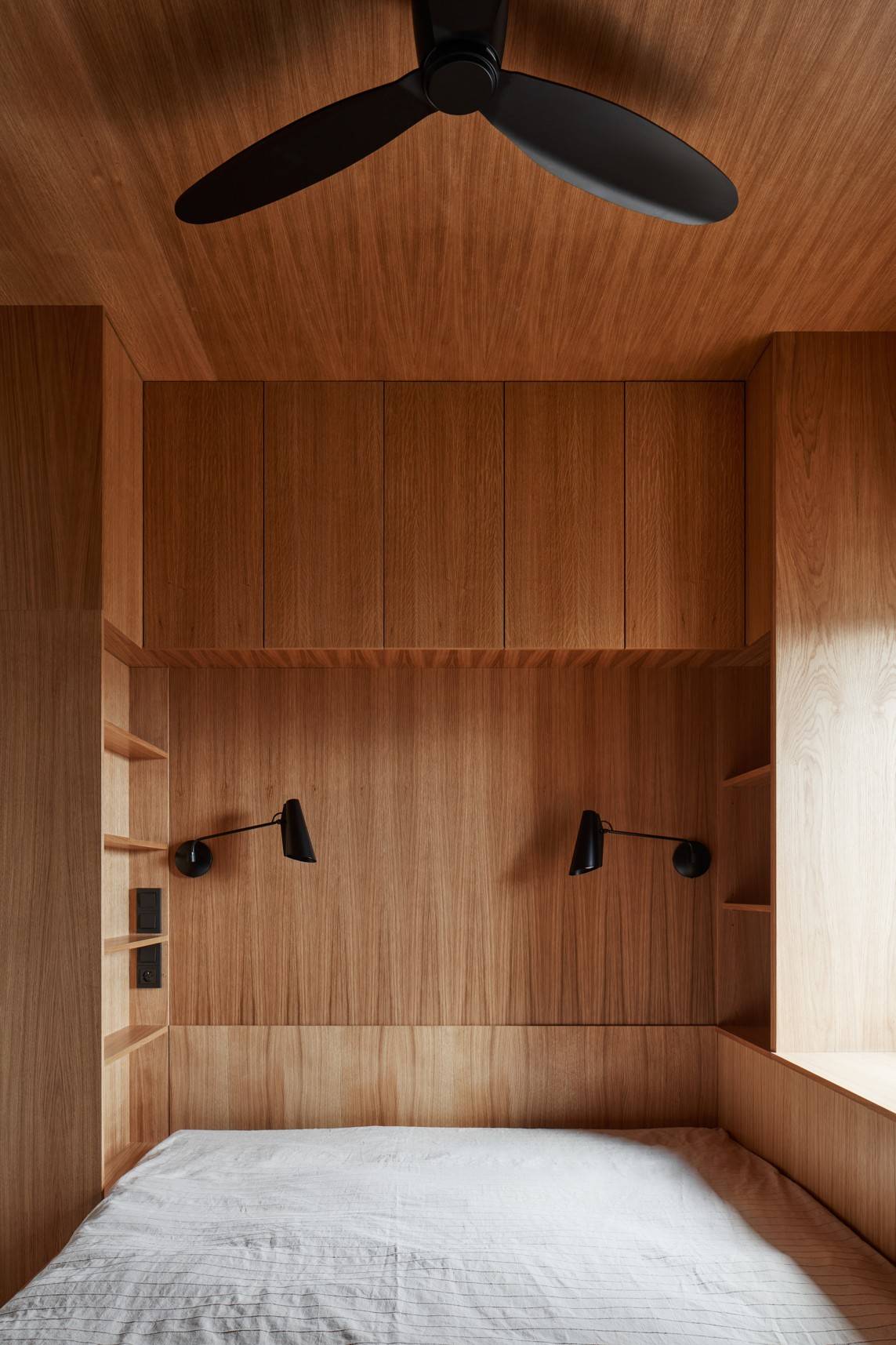 Také v ložnici je dost úložných prostor díky šikovné truhlařině
