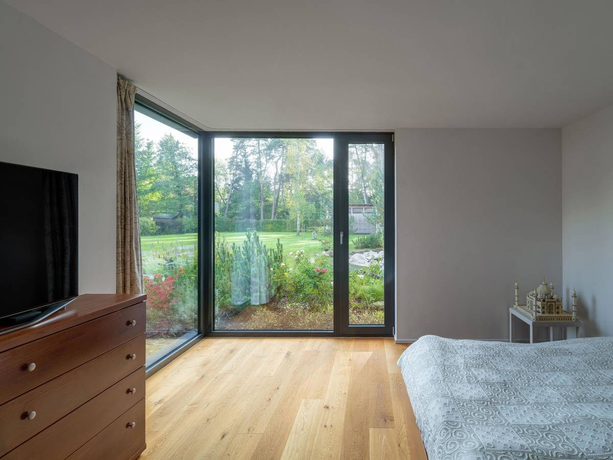 Ložnice rodičů má rohové prosklení a nabízí vizuální kontakt interiéru s okolní přírodou.