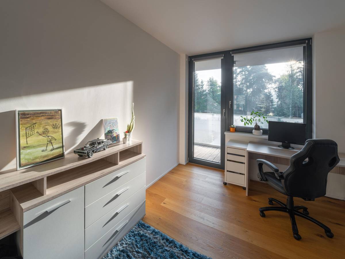Všechny čtyři děti mají svůj vlastní, stejně velký pokoj, jehož výhled směřuje na zahradu a les za ní.