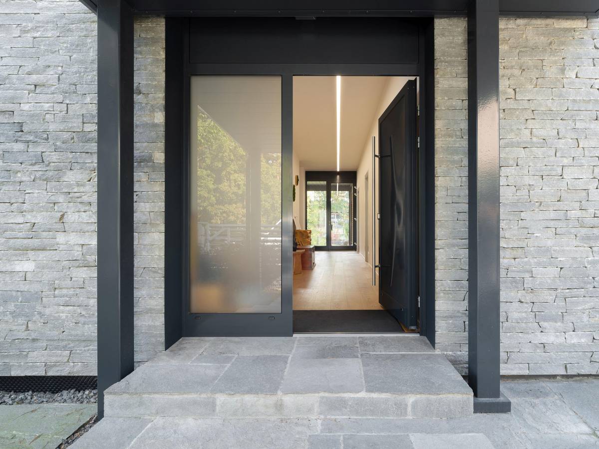 Do moderního domu rodina vchází skrze hliníkové vchodové dveře v antracitovém odstínu s madlem o prodloužené délce 1,6 metru.