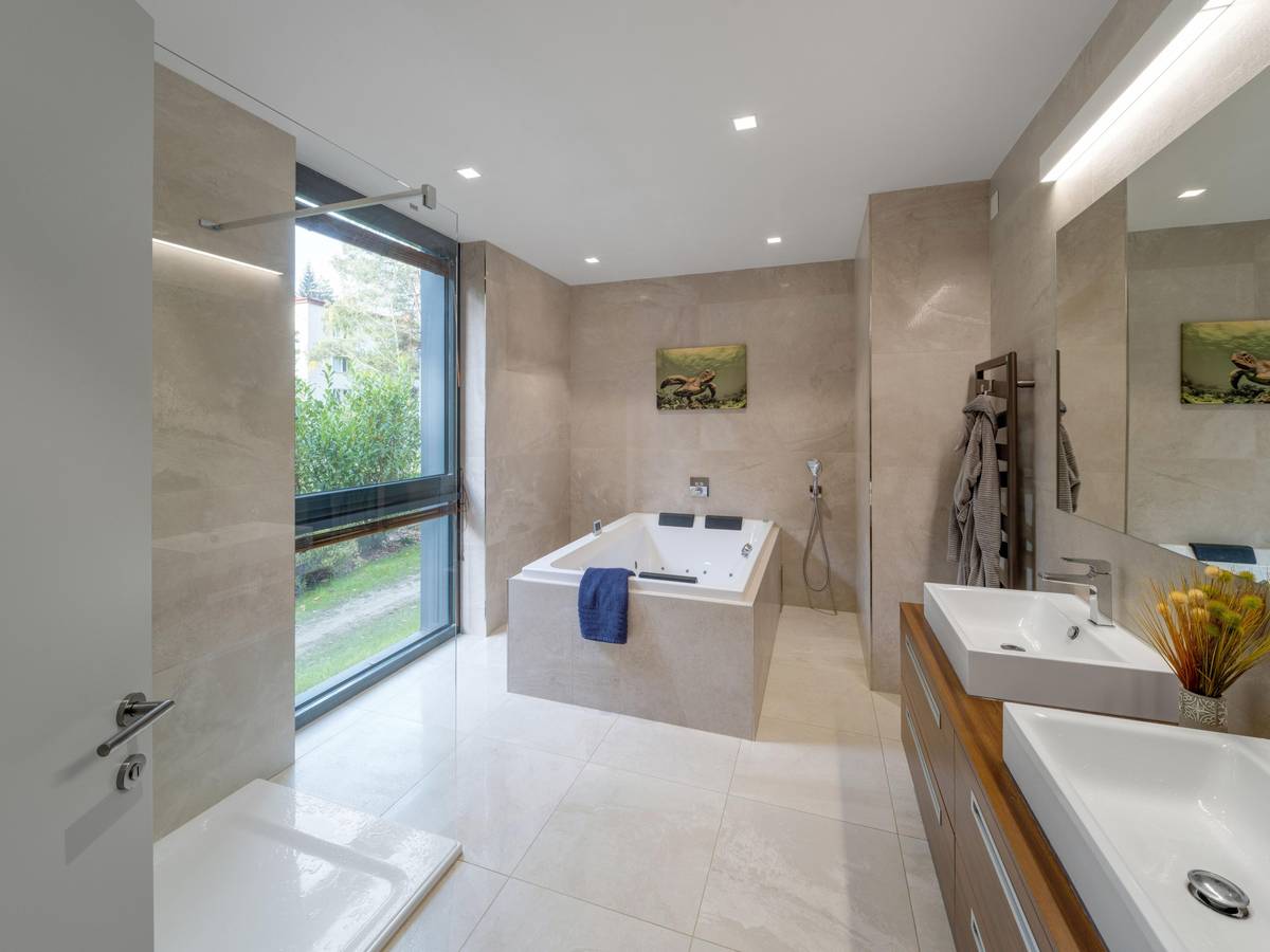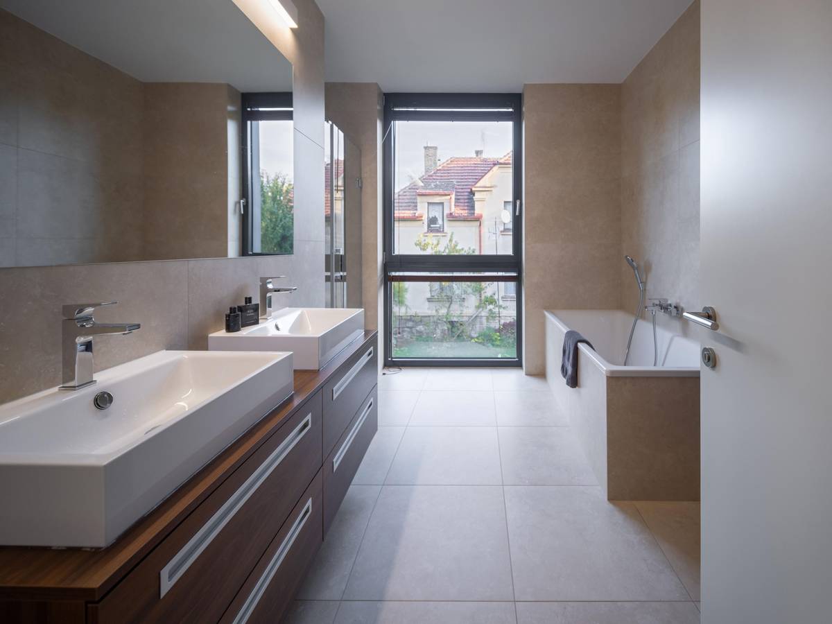 Ve vile jsou celkem tři koupelny. První se nachází v blízkosti hlavní ložnice a je vybavena jak velkou prostornou vanou, tak i sprchovým koutem. Zbývající dvě koupelny architekti situovali do horního patra.