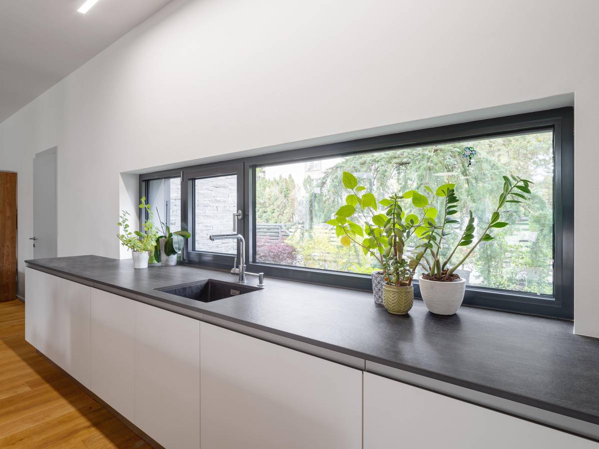 Kuchyňskou pracovní plochu doplňuje výhled z okna.