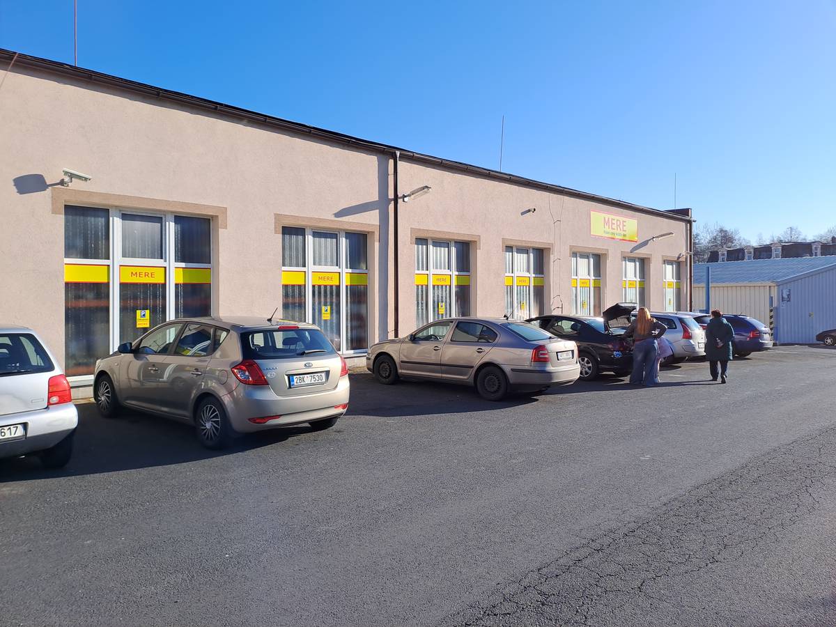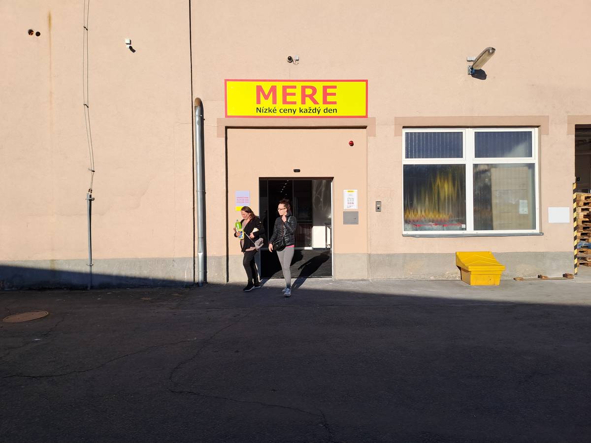 Vstup do karlovarské prodejny MERE. Před otevřením čekaly u dveří dvě zákaznice