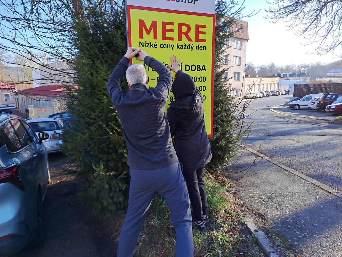 Informační cedule byla umístěna k odbočce k obchodu až po jeho otevření