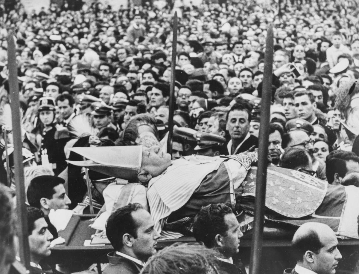 Tělo papeže Jana XXIII. na Svatopetrském náměstí, 5. června 1963.