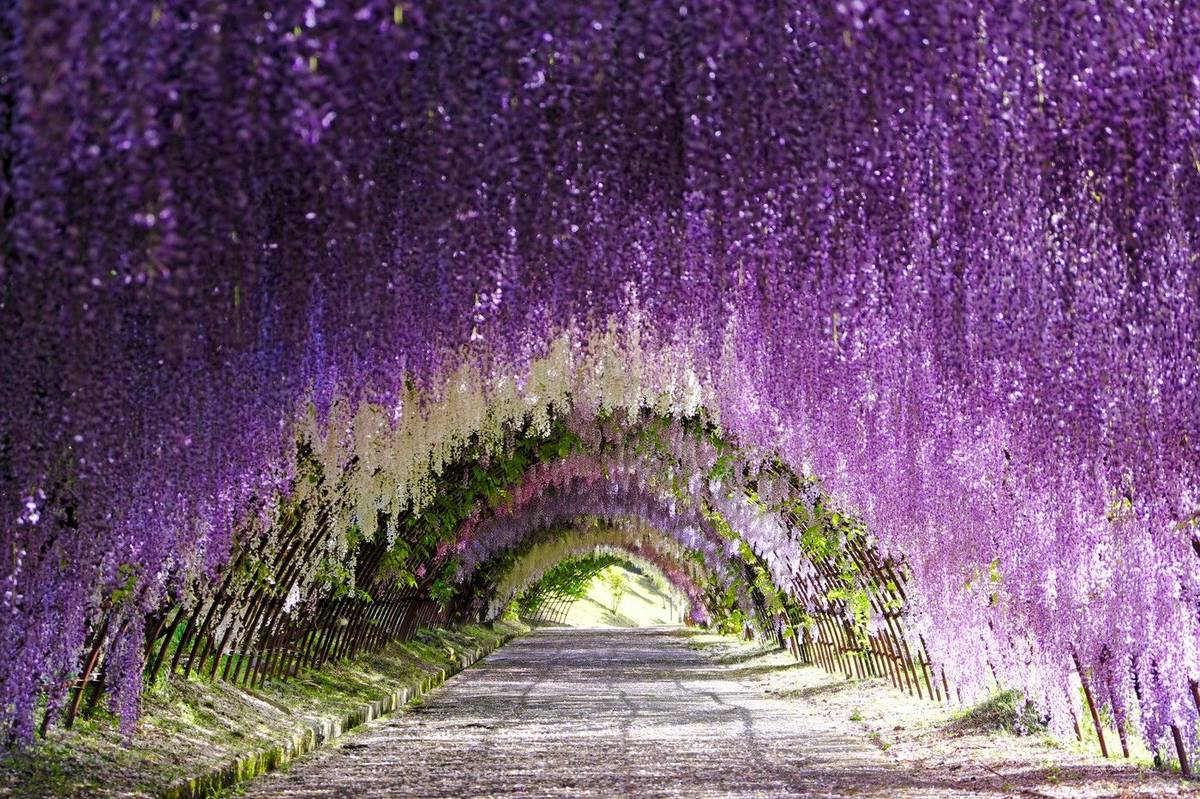 V japonských zahradách Kawachi Fujien kvete každé jaro několik desítek druhů vistárií.