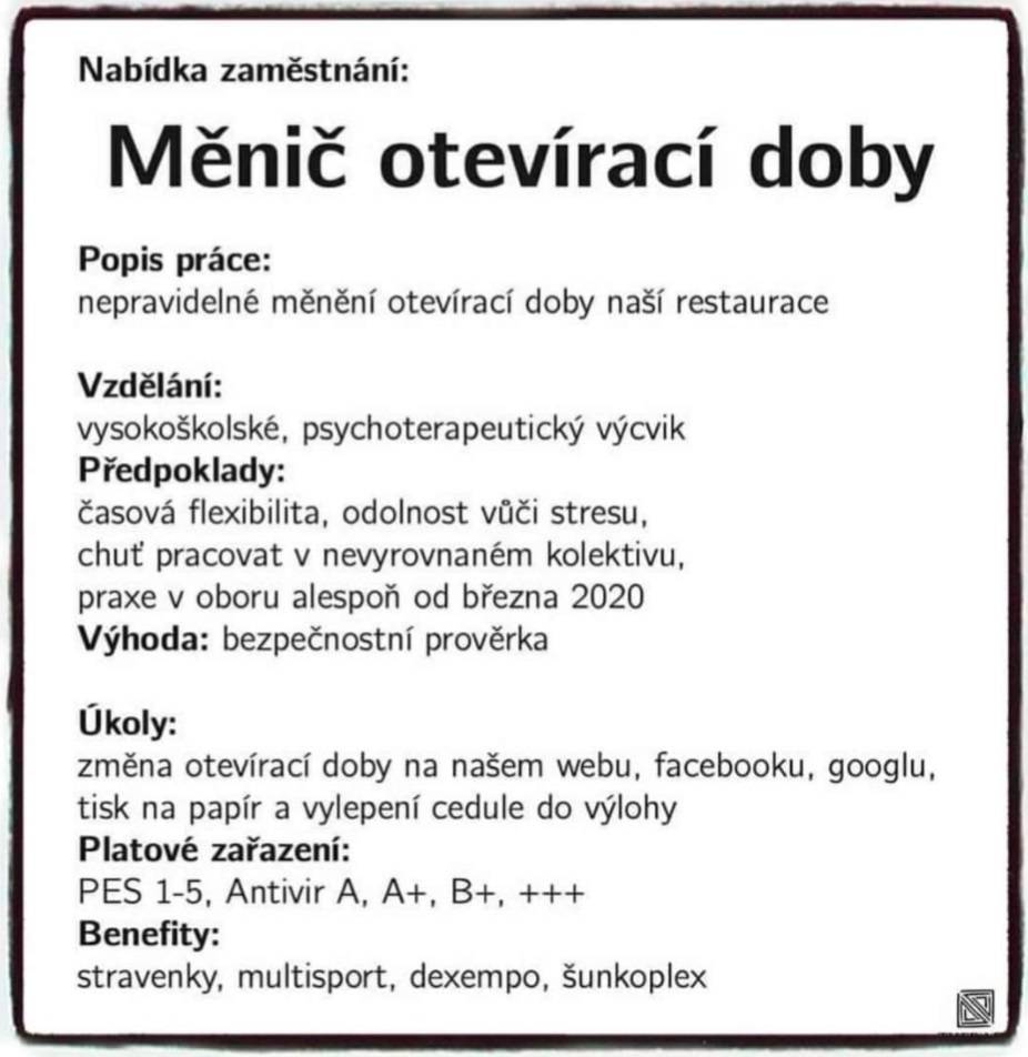 A je to tady! Nová doba si žádá odolné hrdiny. Za práci v nestabilním prostředí s frustrovanými jedinci se můžete těšit na plat ve třídě PES 1–5 a jako benefit dostanete vedle stravenek třeba šunkoplex.