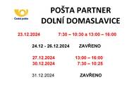 Pošta Partner v Dolních Domaslavicích oznamuje změnu provozní doby během vánočních svátků. Dne 23.12.2024 bude otevřeno od 7:30 do 10:30 a od 13:00 do 16:00. Od 24.12. do 26.12.2024 bude zavřeno. Otevřeno bude opět 27.12. od 13:00 do 16:00 a 30.12. od 7:30 do 10:25. Na Silvestra bude zavřeno.