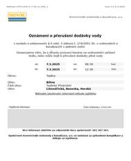 Vážení občané, upozorňujeme, že dnes, tedy v pátek 7. března 2025 může od 8:30 do 12:30 hodin dojít k přerušení dodávky vody v ulicích: - Horská, Bezovka a Litoměřická 825. Důvodem je provozní havárie na vodovodním zařízení. Více informací případně obdržíte na zákaznické lince Severočeských vodovodů a kanalizací 601 267 267.