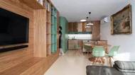 Původně třípokojový panelákový byt s umakartovým jádrem prošel radikální proměnou. Dnes slouží jako stylový letní byt pro šestičlennou rodinu, která miluje architekturu i umění. Zaoblené zelené jádro, tmavá dubová dýha a důmyslně skrytá úložná řešení definují interiér, který je nadčasový, hravý a maximálně funkční.