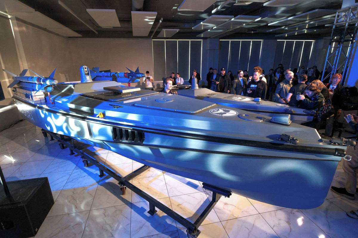 Pohled na ukrajinské útočné námořní drony Magura V7 a V5 během jejich představení.