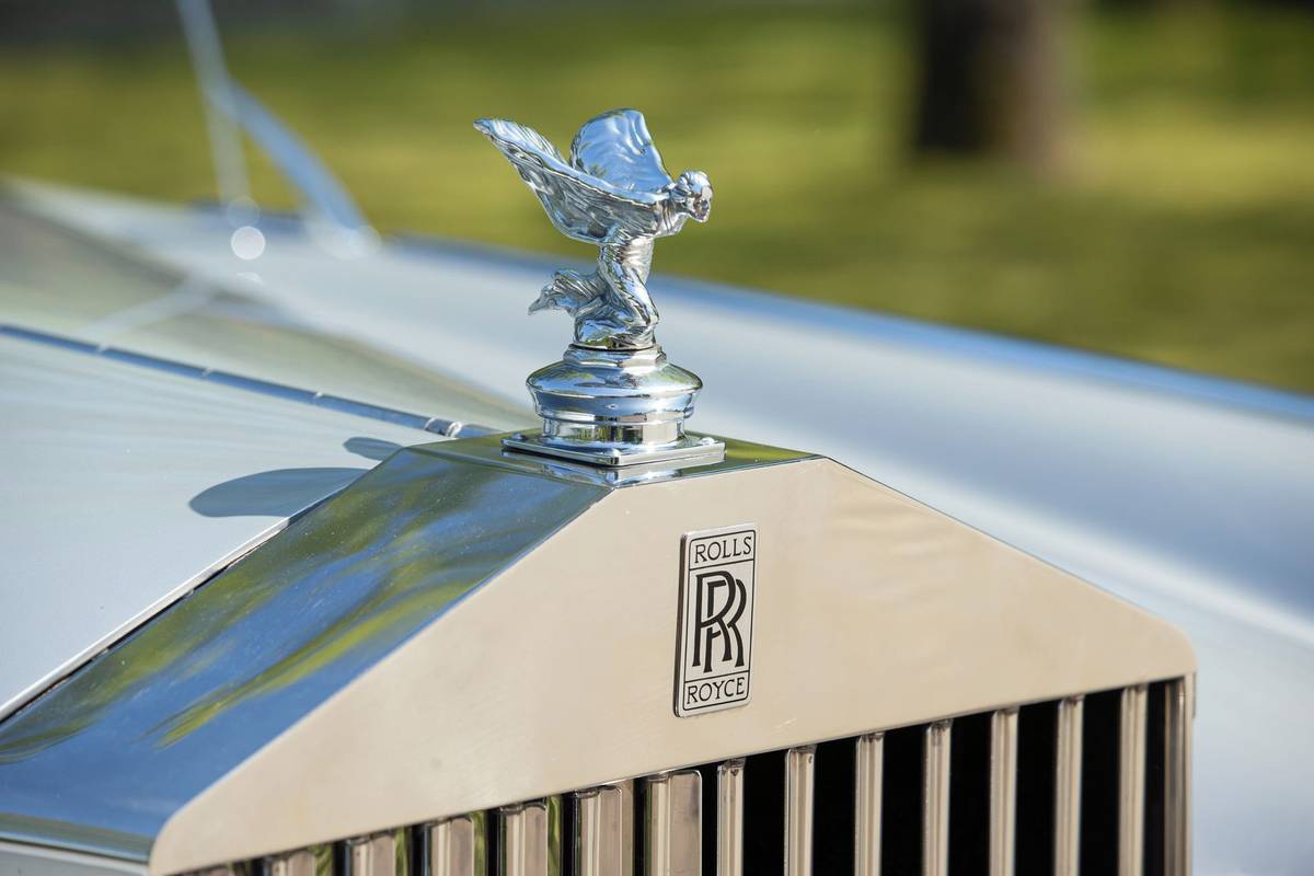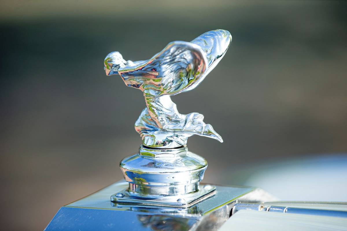 Emily na chladiči netradičně v pokleku. Tato forma prezentace symbolu Rolls-Royce se používala výjimečně, zlopšil se tím výhled z vozu.