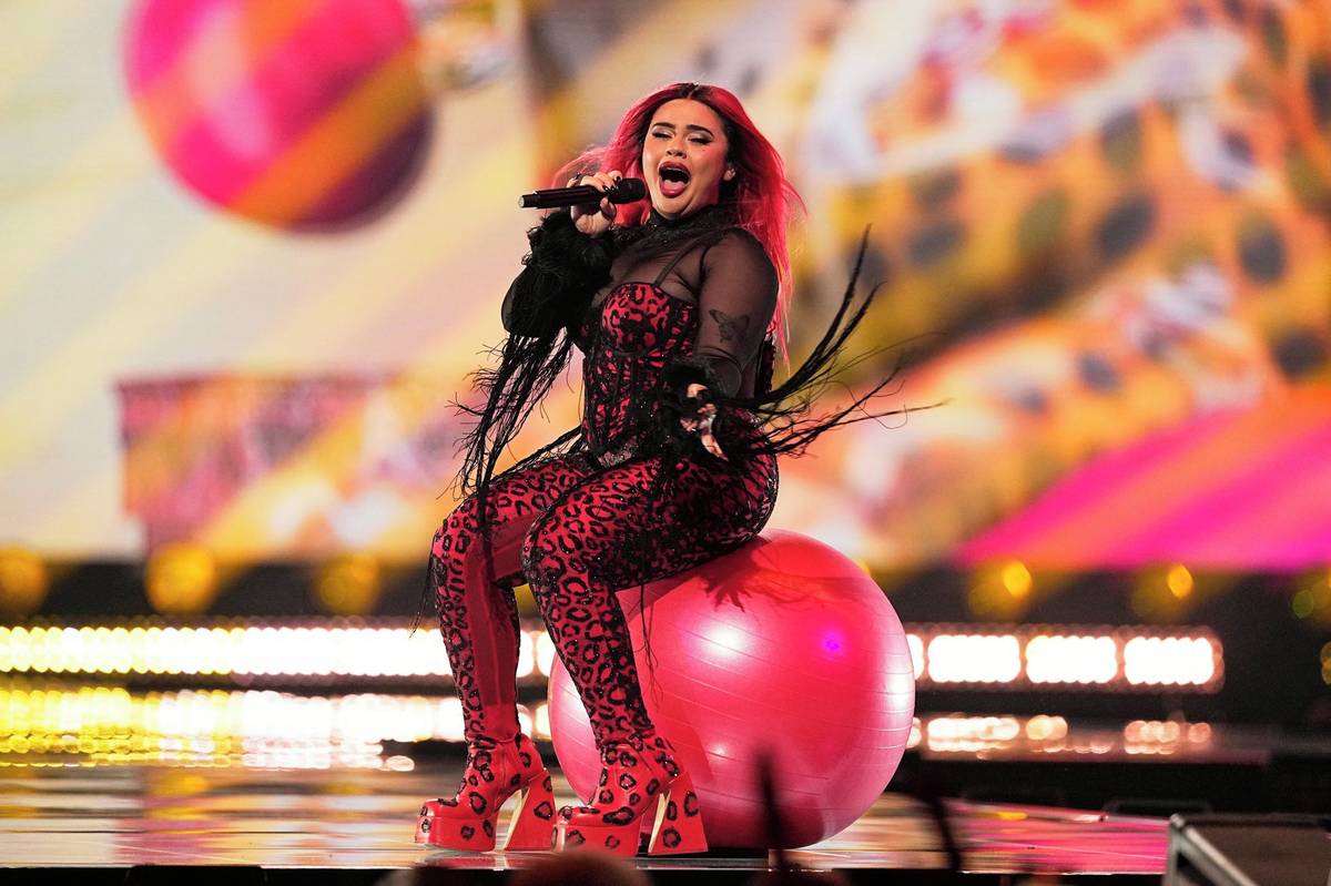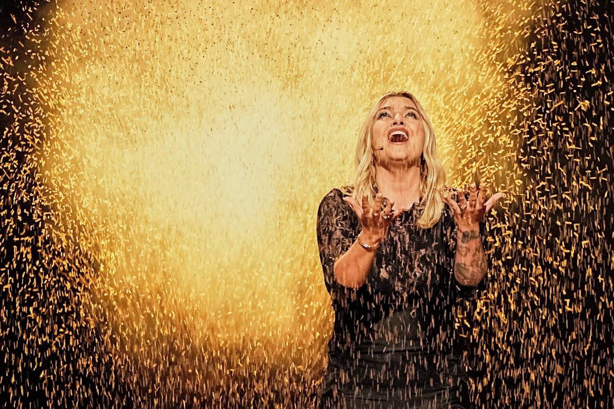 a na konci odletěla na obřím mikrofonu a ohňostrojem.