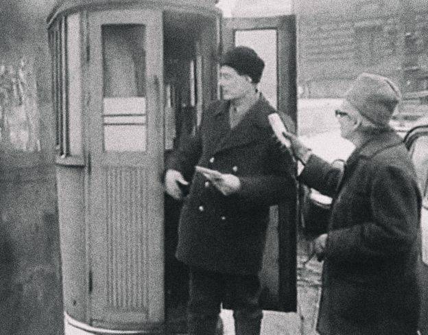 Zaměstnanec dopravního podniku Jaroslav Špírek líčí na dobovém snímku novináři, jak svým kabátem uhasil hořícího Jana Palacha v horní části Václavského náměstí.