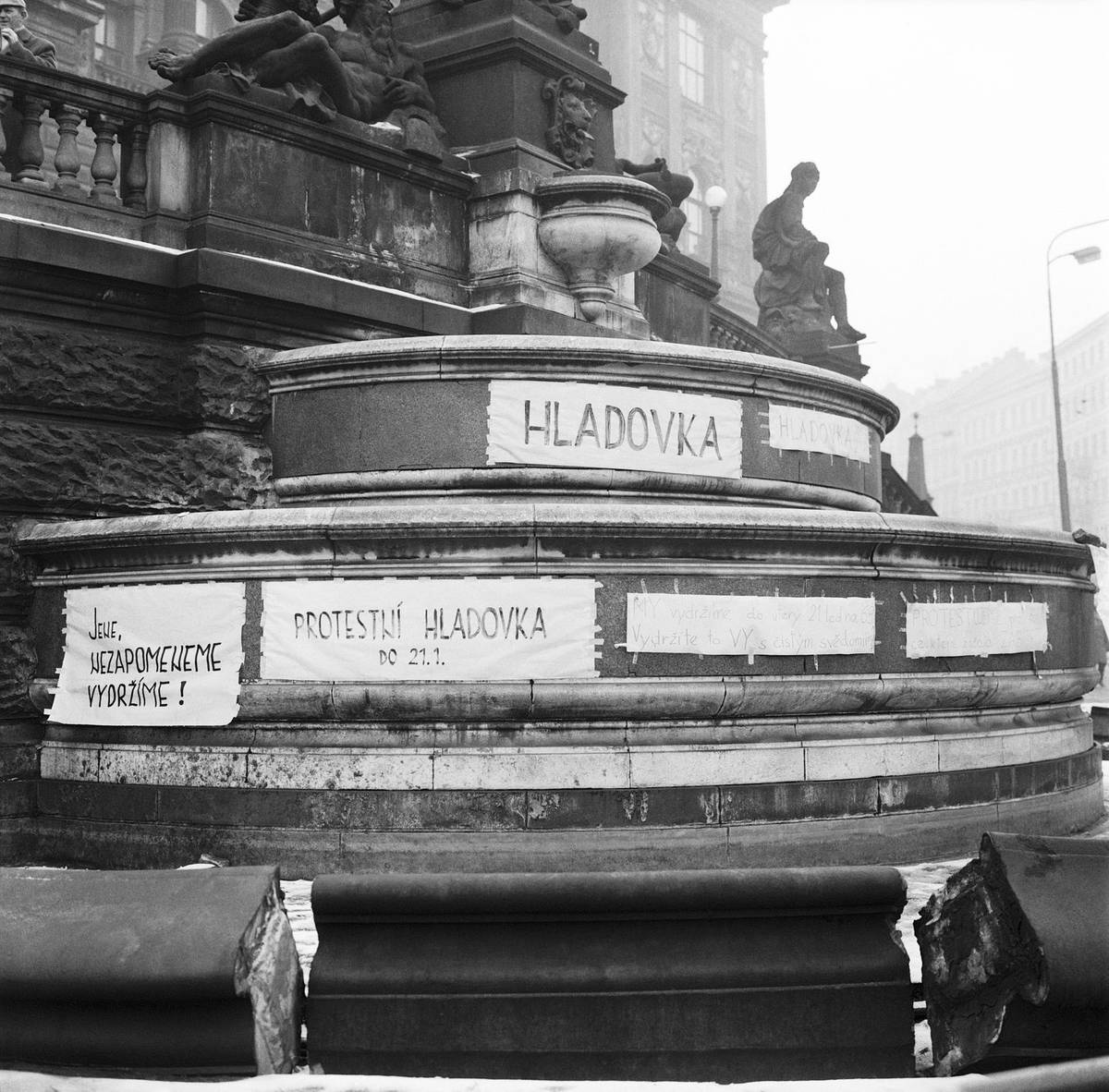 Záběr z protestní hladovky před Národním muzeem, kterou vyhlásili pražští vysokoškoláci po smrti studenta Jana Palacha, který se na tomtéž místě na Václavském náměstí 16. ledna upálil.